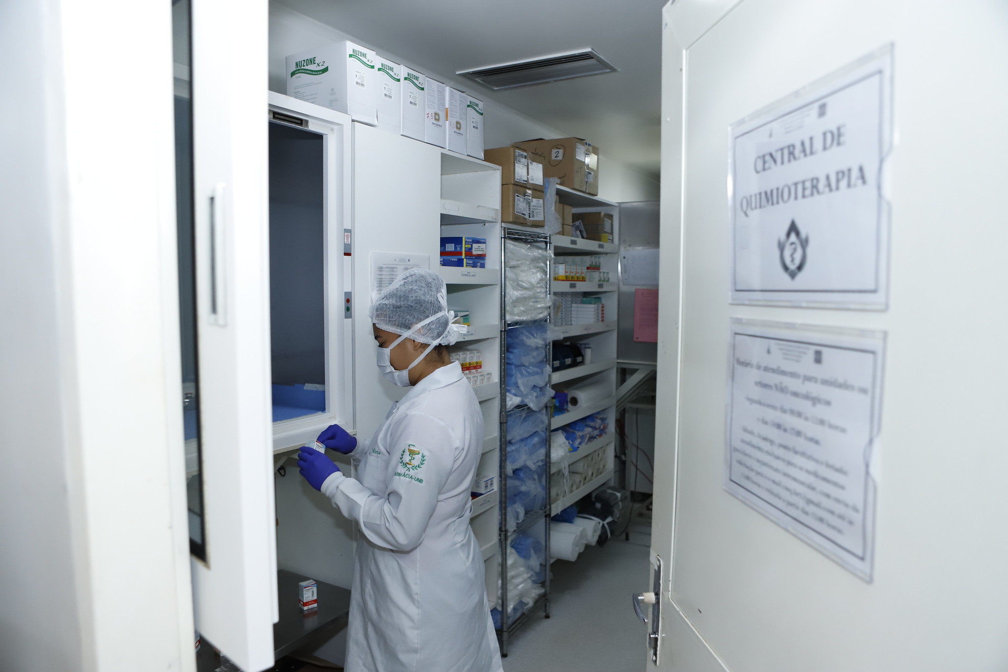 No espaço, servidores passam os insumos para a “sala limpa” por meio de janelas especiais, criadas para evitar a passagem de partículas. Na parte interna, um farmacêutico, com máscara de proteção de risco químico e dois pares de luvas sem pó, manipula os componentes conforme o prescrito pelo oncologista. Depois, a bolsa com o medicamento para quimioterapia é enviada imediatamente ao setor onde ocorre o atendimento ao paciente.