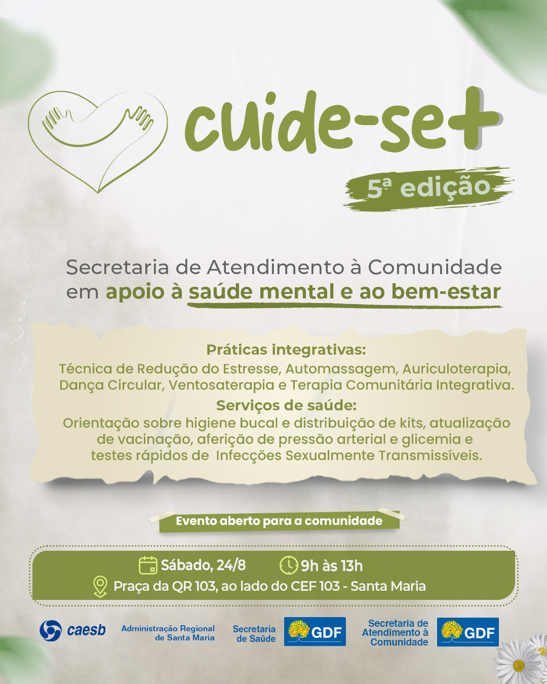A Secretaria de Atendimento à Comunidade (Seac-DF) realiza, neste sábado (24), a 5ª edição do Cuide-se+, uma ação comunitária voltada para o apoio à saúde mental e ao bem-estar da comunidade. O evento ocorrerá das 9h às 13h na praça da QR 103, ao lado do CEF 103, em Santa Maria, e é aberto à população.