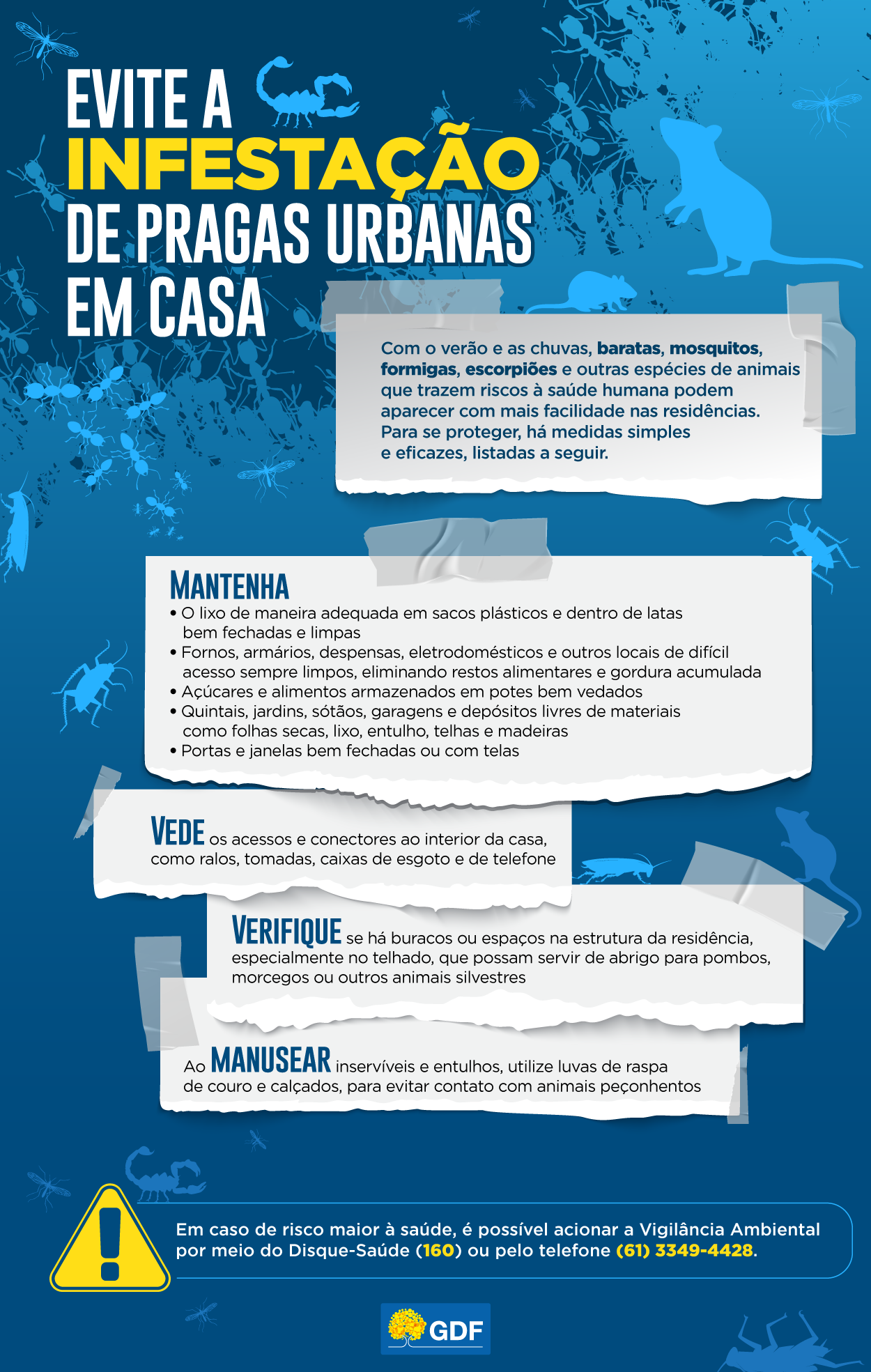 Com a chegada do verão, a alta temperatura e as chuvas da época podem ser fatores de influência na proliferação de pragas urbanas nas residências. Pernilongos, formigas, cupins e baratas se tornam mais ativos e propensos a aparecer nas áreas residenciais em busca de alimento. Para ajudar a população, a Agência Brasília separou algumas orientações da Secretaria de Saúde do Distrito Federal (SES-DF) que contribuem para a criação de um ambiente mais seguro e saudável nas comunidades.