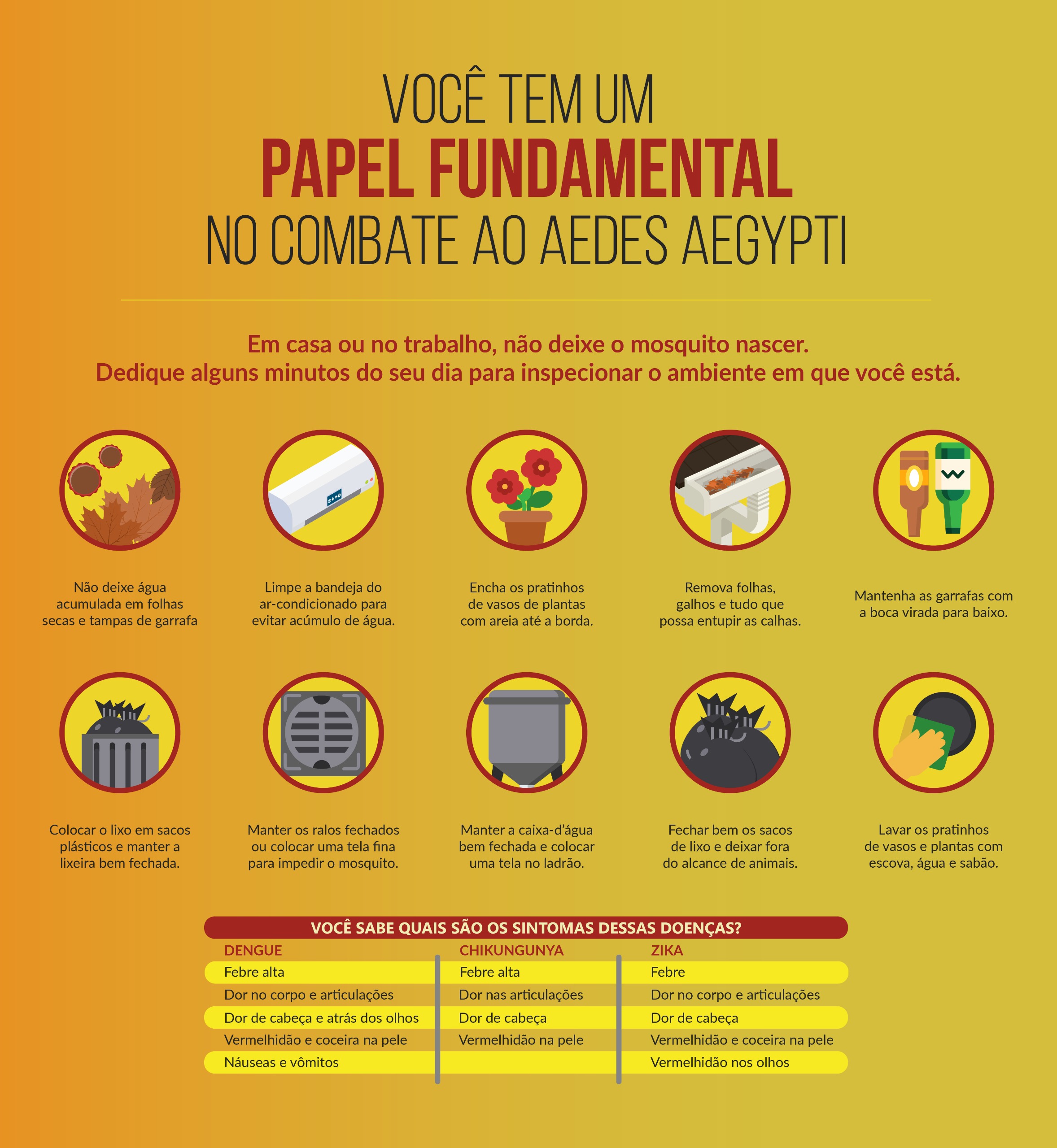 As inspeções aos imóveis, nesses casos, servem para a eliminação dos locais com água parada onde a fêmea do mosquito deposita seus ovos. O Aedes aegypti põe seus ovos em recipientes como vasos, garrafas, calhas, caixas d’água descobertas ou qualquer outro objeto que possa armazenar água. Quando chove, o nível da água sobe e entra em contato com os ovos que eclodem em poucos minutos.