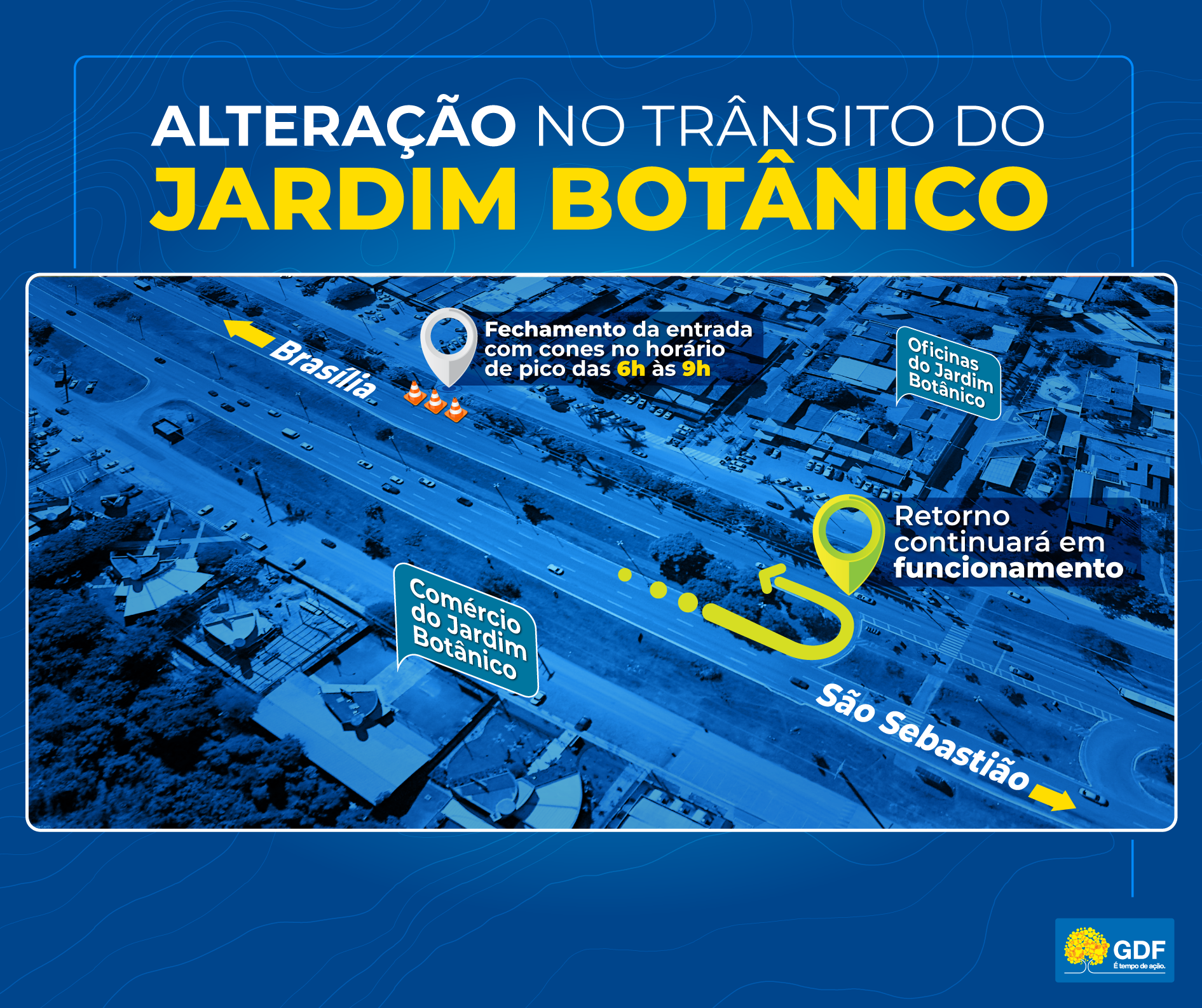 Além da interdição, a rotatória que fica nas proximidades do condomínio Mansões Califórnia terá a preferência alterada. Se antes o acesso ao balão era priorizado aos veículos que trafegavam pela marginal, agora a prevalência será dos motoristas vindos da DF-001. “Teremos painéis luminosos orientando os motoristas sobre todas essas mudanças no trânsito”, avisa Elcy.
