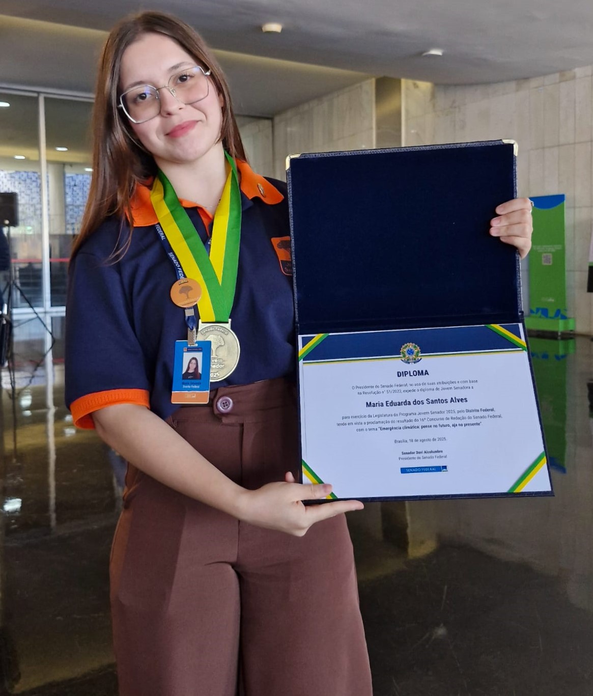 Maria Eduarda foi selecionada por meio do concurso de redação do programa, que neste ano teve como tema “Emergência Climática: pense no futuro, aja no presente”. O texto foi escolhido entre os melhores produzidos por estudantes da rede pública do DF e passou por uma seleção feita por comissões avaliadoras da SEEDF e do Senado.