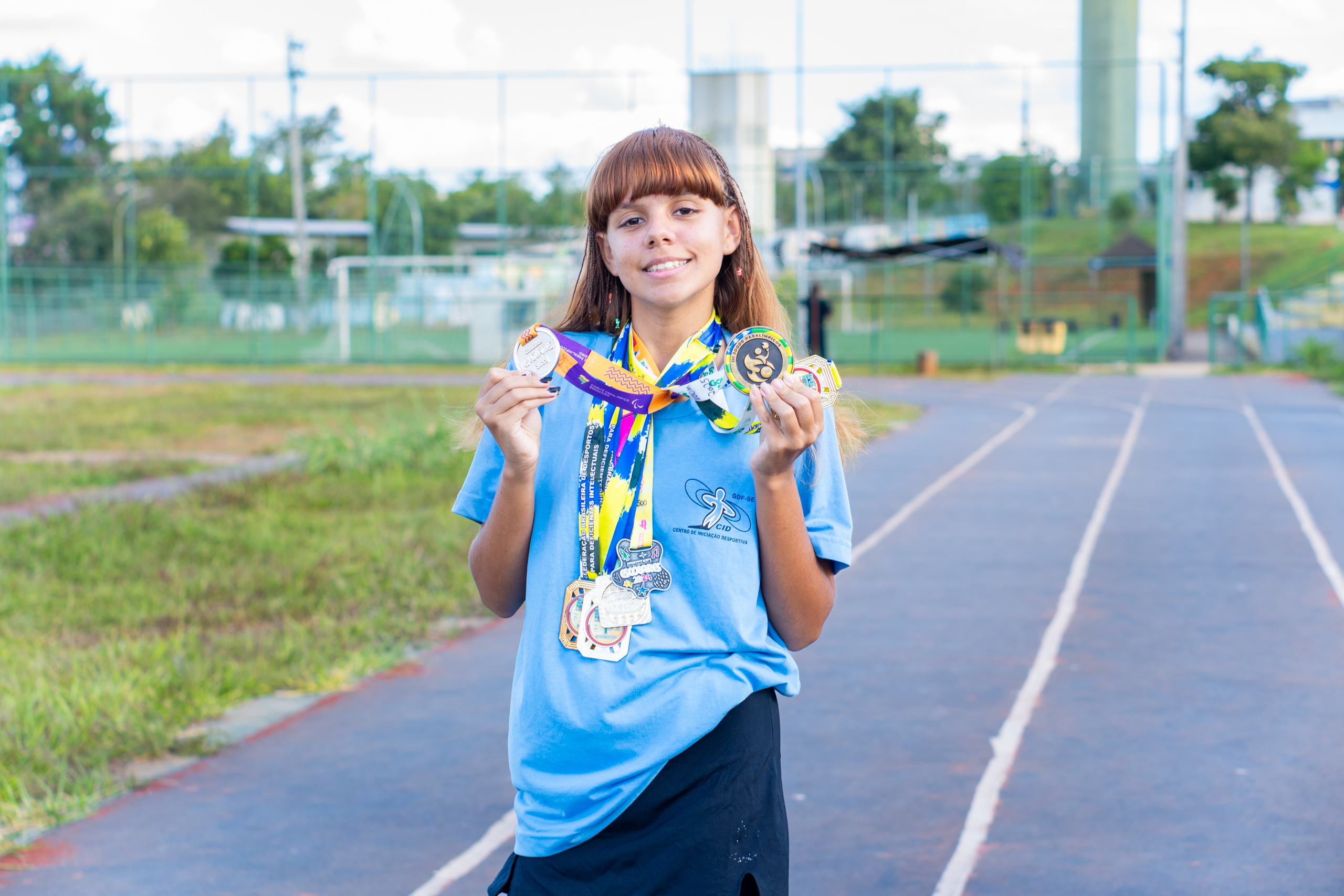 Quem também trilha esse caminho de superação é Juliana Gomes, de 17 anos. Com deficiência intelectual, a jovem vai representar o CEM 01 de São Sebastião na prova de atletismo neste fim de semana (14 e 15). Ela começou a treinar em 2021, após a perda do pai durante a pandemia. “No começo, só dava meia-volta na pista e queria parar. Mas a Tia Lu e o Tio Xande acreditaram em mim. Hoje tenho 50 medalhas”, comemora.