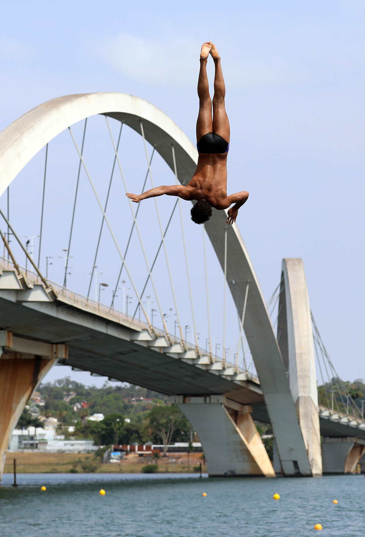 Um dos principais cartões-postais de Brasília será palco de saltos de até 27 metros de altura neste final de semana. Com apoio do Governo do Distrito Federal (GDF), a Ponte JK recebe a Copa do Mundo e o Mundial Júnior de High Diving, torneios internacionais inéditos no Brasil. De sexta-feira (11) a domingo (13), mais de 80 atletas de 19 países vão participar das disputas – maior número de competidores já registrado na modalidade, segundo a organização do evento. Os atletas brasilienses Rafael Borges, Miguel Cardoso e Janine Freitas representarão a capital federal com garra e dedicação.