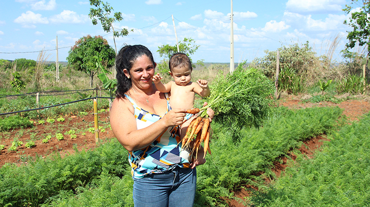 A produtora rural Mariazinha Porto dos Santos (38), moradora do Assentamento 15 de Agosto, em São Sebastião, divide os cuidados com a produção de hortaliças, cuidando da casa e dos três filhos, de 11, 6 anos e apenas 11 meses. A família é assentada há 10 anos, quando Mariazinha decidiu deixar o trabalho de diarista para se transformar em produtora rural e viver da terra. Apesar de o marido lhe ajudar com a produção orgânica de alface, cenoura, salsinha, cebolinha, brócolis, couve e batata-doce que vendem para o PAA há cinco anos, não é fácil dar conta de todos os afazeres.