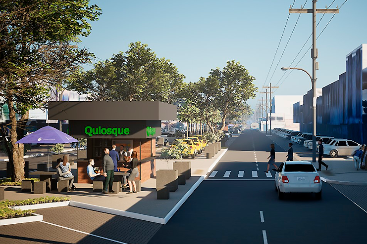 Nos estacionamentos junto aos edifícios, o espaço será compartilhado com bicicletas. As calçadas próximas ao comércio serão organizadas em faixas, com rampas e escadas. Na Praça do Mercadão, após a escadaria, serão instalados pergolados para apoiar o comércio local e integrar a 3ª Avenida à Avenida Central.