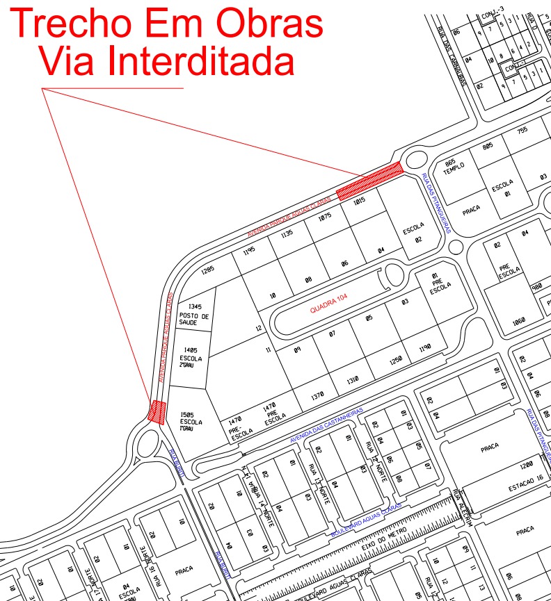 Neste sábado (16), das 8h às 12h, haverá interdição total da Avenida Parque Águas Claras, no trecho próximo à quadra 104 e à terceira saída de Águas Claras, devido à realização de obra com utilização de guindaste e veículos de grande porte para movimentação de containers.