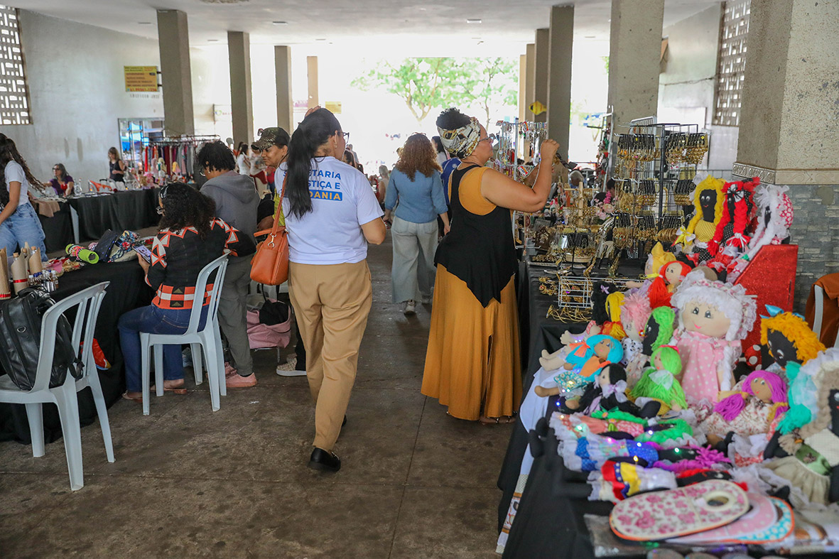 Entre terça (3) e esta quinta (5), em parceria com a prefeitura do Setor Comercial Sul (SCS), a Sejus reuniu cerca de 200 artesãs para a comercialização de produtos na passarela central do SCS no Vila Banco de Talentos, um espaço de exposição e venda de produtos personalizados por artesãs que realizaram oficinas e aulas nos núcleos do programa Direito Delas, que tem o objetivo de oferecer atendimentos social, psicológico e jurídico às vítimas diretas de violência.