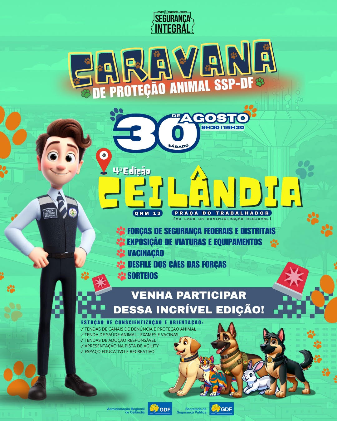 No próximo sábado (30), a Praça do Trabalhador (QNM 13), ao lado da Administração Regional de Ceilândia, receberá a 4ª edição da Caravana de Proteção Animal da Secretaria de Segurança Pública do DF (SSP-DF). O evento ocorrerá das 9h30 às 15h30 e vai oferecer uma programação especial com serviços gratuitos tanto para os animais de estimação quanto para os tutores e comunidade em geral, como atendimentos jurídicos e emissão de documentos.