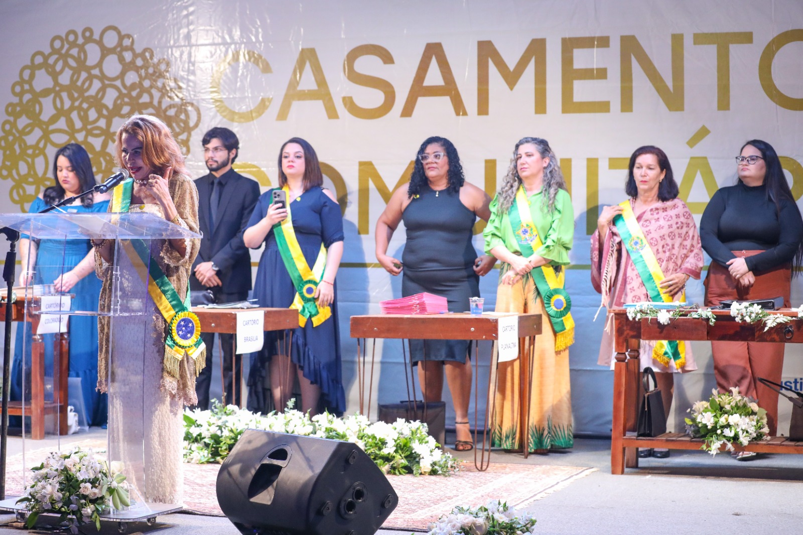 A oficialização das uniões foi feita por quatro juízas de paz. “Para mim, é sempre uma honra. Isso é renovação, cidadania. É trazer para essas famílias pertencimento. Casamento traz pertencimento. E esse projeto é grandioso. Se for definir em uma palavra é grandiosidade”, apontou Mírtala Delmondez, uma das juízas, sobre o Casamento Comunitário.