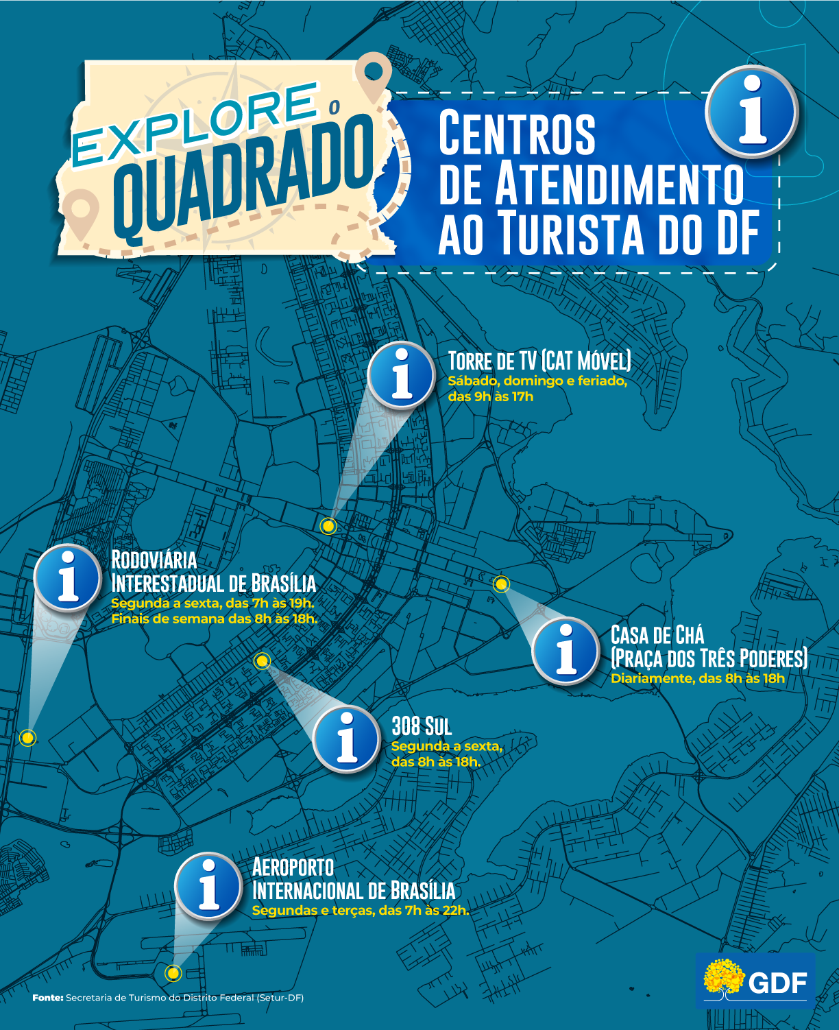 O Centro de Atendimento ao Turista do aeroporto dispõe de uma área total de 33,65 metros quadrados e funciona segunda e terça, das 7h às 22h. Além dessa unidade, o DF conta com postos na 308 Sul, Torre de TV, Rodoviária Interestadual e Casa de Chá. Todos oferecem tratamento bilíngue, distribuição de mapas e guias turísticos, além de materiais promocionais. Juntos, os CATs realizaram mais de 1,3 mil atendimentos no primeiro semestre deste ano.