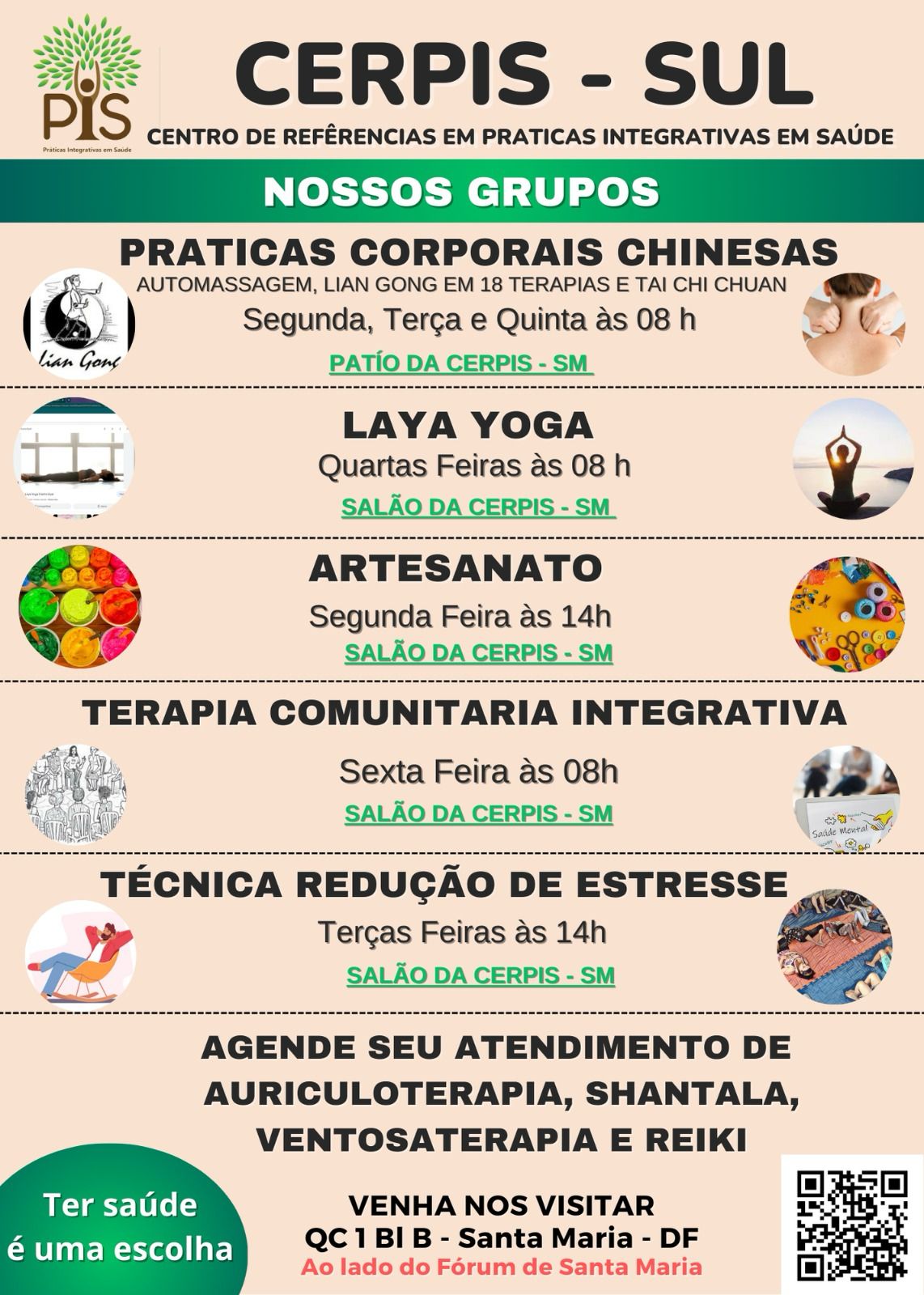 Situada no centro de Santa Maria – QC 1, bloco B, próximo ao fórum da região e da antiga administração regional –, a sede recém-inaugurada incrementa o número e a qualidade dos atendimentos. Isso porque a localização anterior, na Unidade Básica de Saúde (UBS) 10 do DVO/Gama, continua a oferecer diversas práticas integrativas em saúde (PIS).