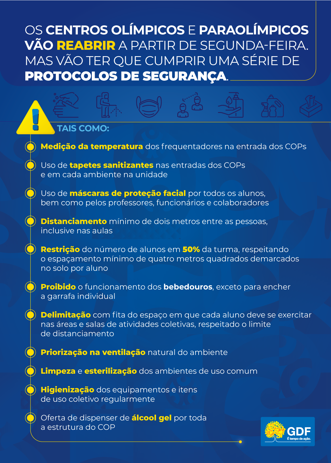 Está em andamento processo de reforma de três centros olímpicos e compra de 70 aquecedores para as piscinas. Também está sendo desenvolvido o projeto para construção do novo Centro Olímpico no Paranoá. Os 12 COPs passam por chamamentos públicos para seleção de instituições sem fins lucrativos, responsáveis pelo corpo pedagógico das unidades, sendo que o processo dos centros de Brazlândia, Recanto das Emas e Estrutural estão completamente finalizados. À medida que os demais procedimentos administrativos forem concluídos, as unidades retornarão a receber, presencialmente, o público.