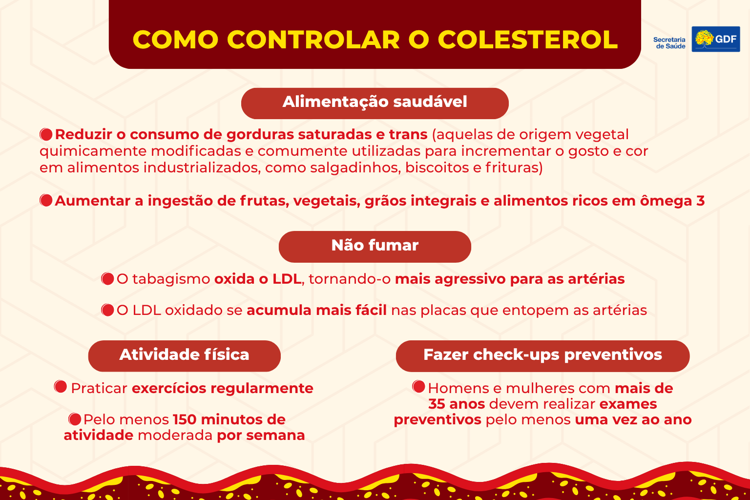 Fundamental para o bom funcionamento do corpo, o colesterol em excesso causa a formação de placas nas paredes das artérias e doenças como angina, infarto do miocárdio, insuficiência cardíaca e até morte súbita. Quando acomete as artérias carótidas e cerebrais, pode levar a acidentes vasculares cerebrais (AVC). No Dia Mundial de Combate ao Colesterol, celebrado nesta sexta-feira (8), a Secretaria de Saúde do Distrito Federal (SES-DF) alerta para ações preventivas e cuidados com a saúde cardiovascular.