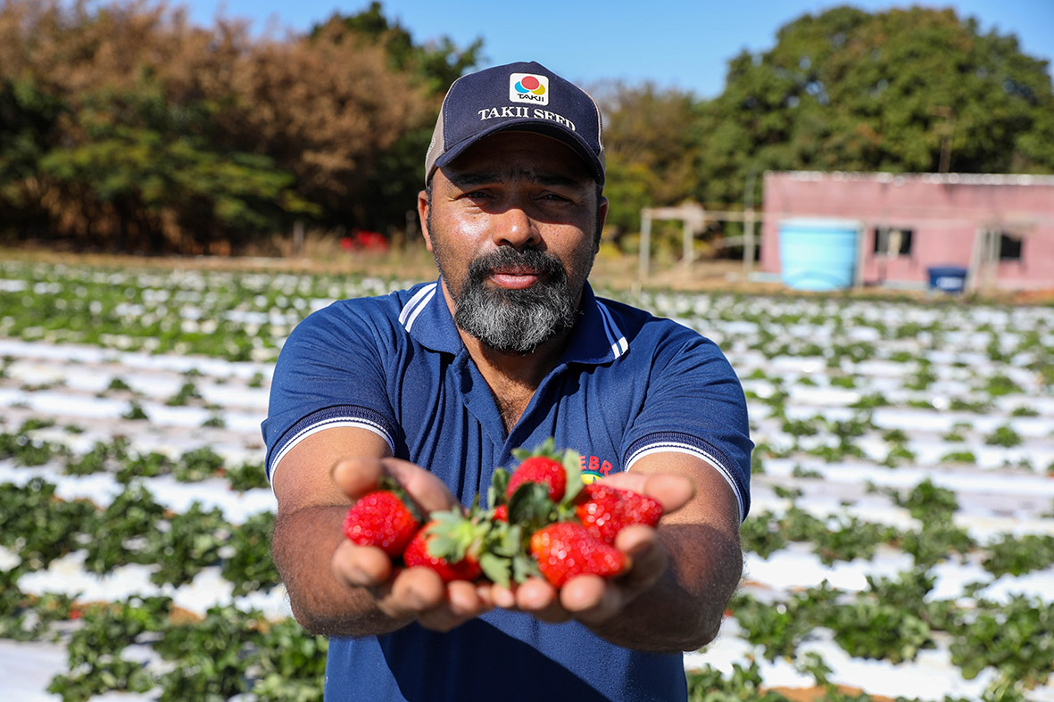 Há 35 anos em Brazlândia, o produtor rural Marcos Almeida cultiva morangos há 10 anos. Ele conta que decidiu investir no cultivo pela boa produtividade sem a necessidade de grandes áreas de plantio. Com isso, ele consegue trabalhar apenas ao lado da esposa, Dilza Andrade. “A gente usa mão de obra familiar e colhe muito numa área pequena”, explica. “Neste ano, mudei de variedade com a expectativa de colher um pouco mais. Mais ou menos uma caixa, uma caixa e meia por planta”, estima.