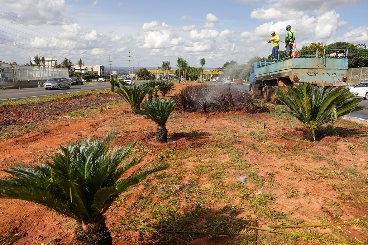 O paisagismo é uma demanda da Secretaria de Obras e Infraestrutura (SODF) e tem sido conduzido com foco em impacto visual imediato, mas também leva em consideração critérios técnicos e de sustentabilidade. A escolha por palmeiras, em detrimento de árvores de copa densa, se deve à necessidade de manter a visibilidade e a segurança nas vias, pois, em sistemas viários, uma arborização fechada cria uma cortina que prejudica o deslocamento e a fluidez do trânsito, e as palmeiras permitem compor o paisagismo sem criar barreiras visuais.