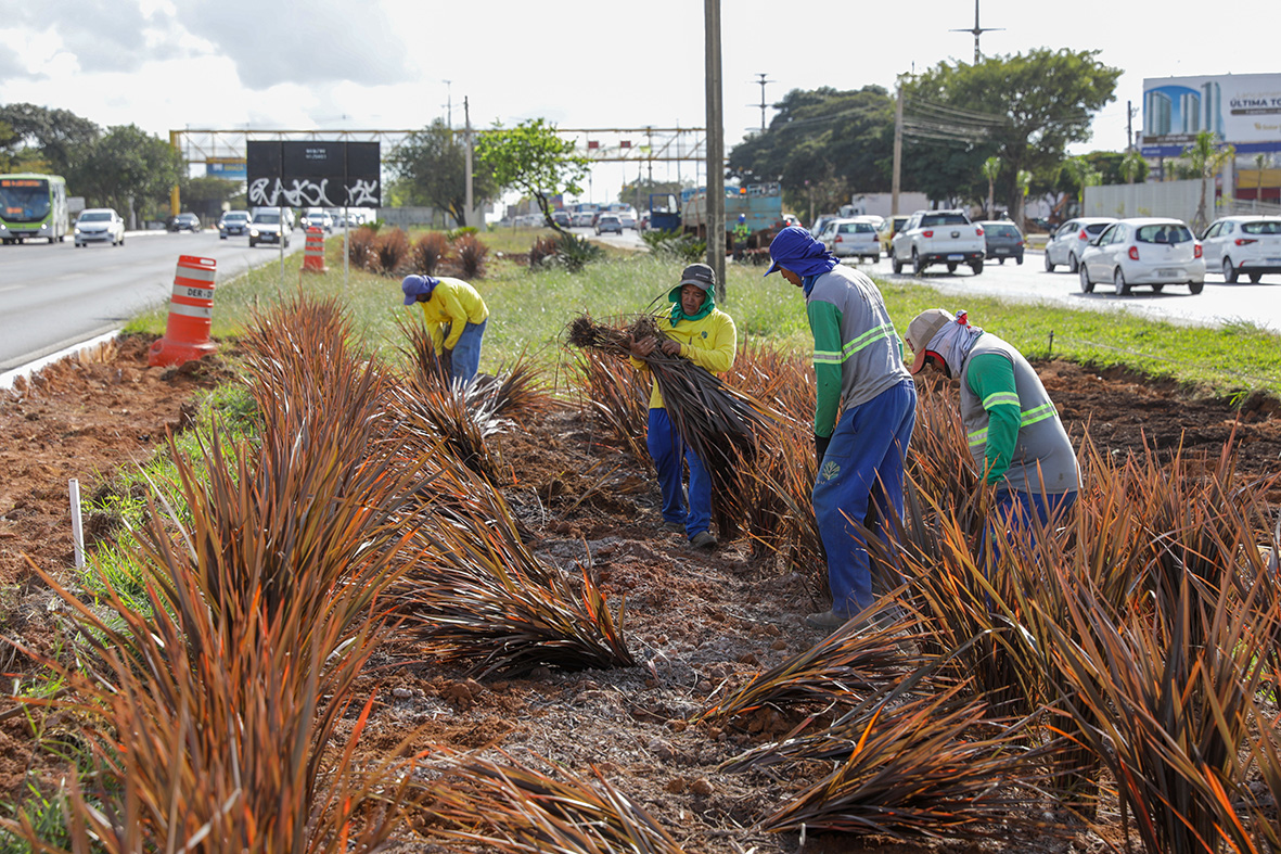 Raimundo destaca, no entanto, que a escolha das espécies também leva em conta a necessidade de manutenção e o uso racional da água. “Estamos em um momento de escassez hídrica. Por isso, optamos por plantas mais resistentes, que demandem menos irrigação”, afirma. Ele faz um contraponto com o paisagismo do balão do Aeroporto Internacional de Brasília, que utiliza flores ornamentais e exige manutenção constante, com replantio a cada 90 dias para manter o impacto visual: “As pessoas não devem esperar esse tipo de paisagismo em obras viárias. Ali é um caso específico, com canteiros baixos, pouco trânsito e alta frequência de cuidados. Já aqui, priorizamos espécies de baixa manutenção e adaptadas ao clima do Cerrado.”