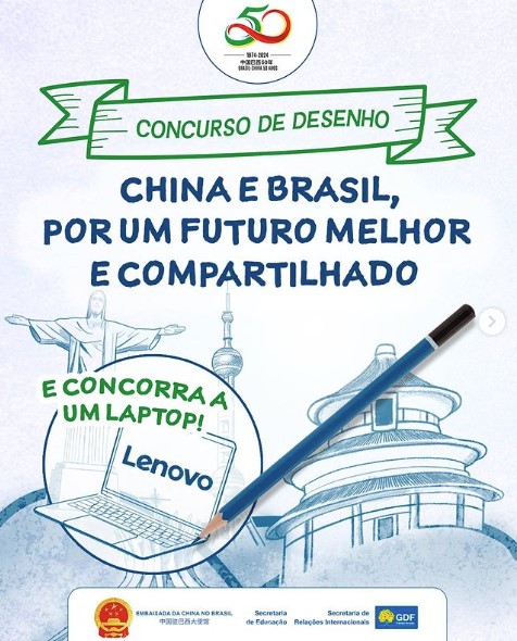 Para comemorar os 50 anos das relações diplomáticas entre o Brasil e a China, a embaixada do país oriental lançou o concurso cultural de desenho para todas as idades com o tema China e Brasil por um futuro melhor e compartilhado. Em parceria com as secretarias de Relações Internacionais e de Educação, os melhores desenhos serão premiados com um laptop. Os interessados podem se inscrever até 31 de maio neste link e o resultado será divulgado em agosto.