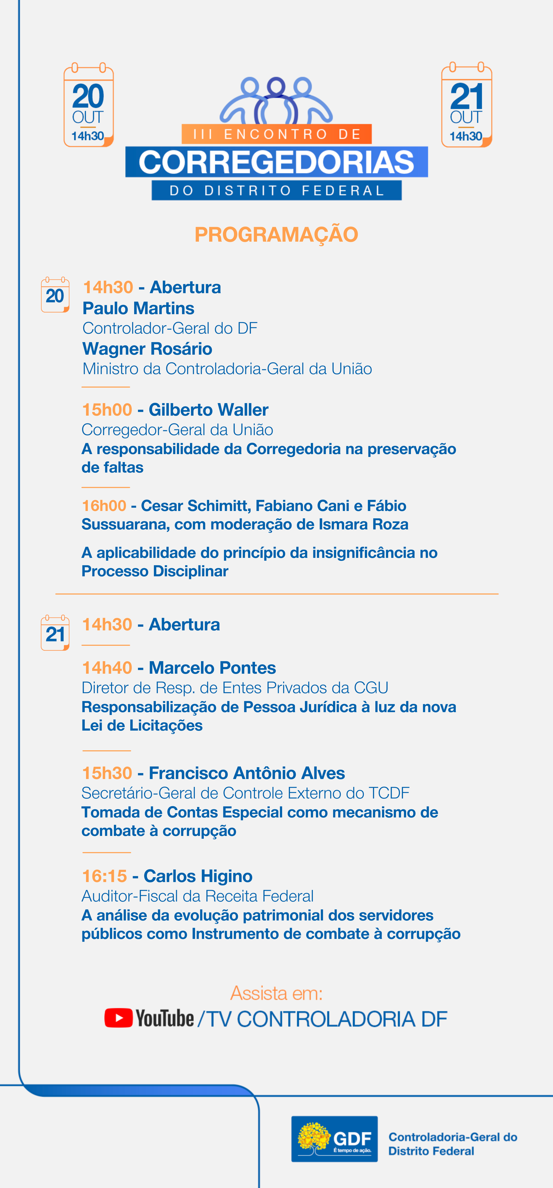 A Controladoria-Geral do Distrito Federal (CGDF) realizará, nos dias 20 e 21 de outubro, a partir das 14h30, o III Encontro de Corregedorias do Distrito Federal. O evento será transmitido pela TV Controladoria DF no YouTube e reunirá servidores públicos que atuam ou têm interesse em atividades correcionais para conhecerem melhores práticas relacionadas ao desempenho da atividade disciplinar.