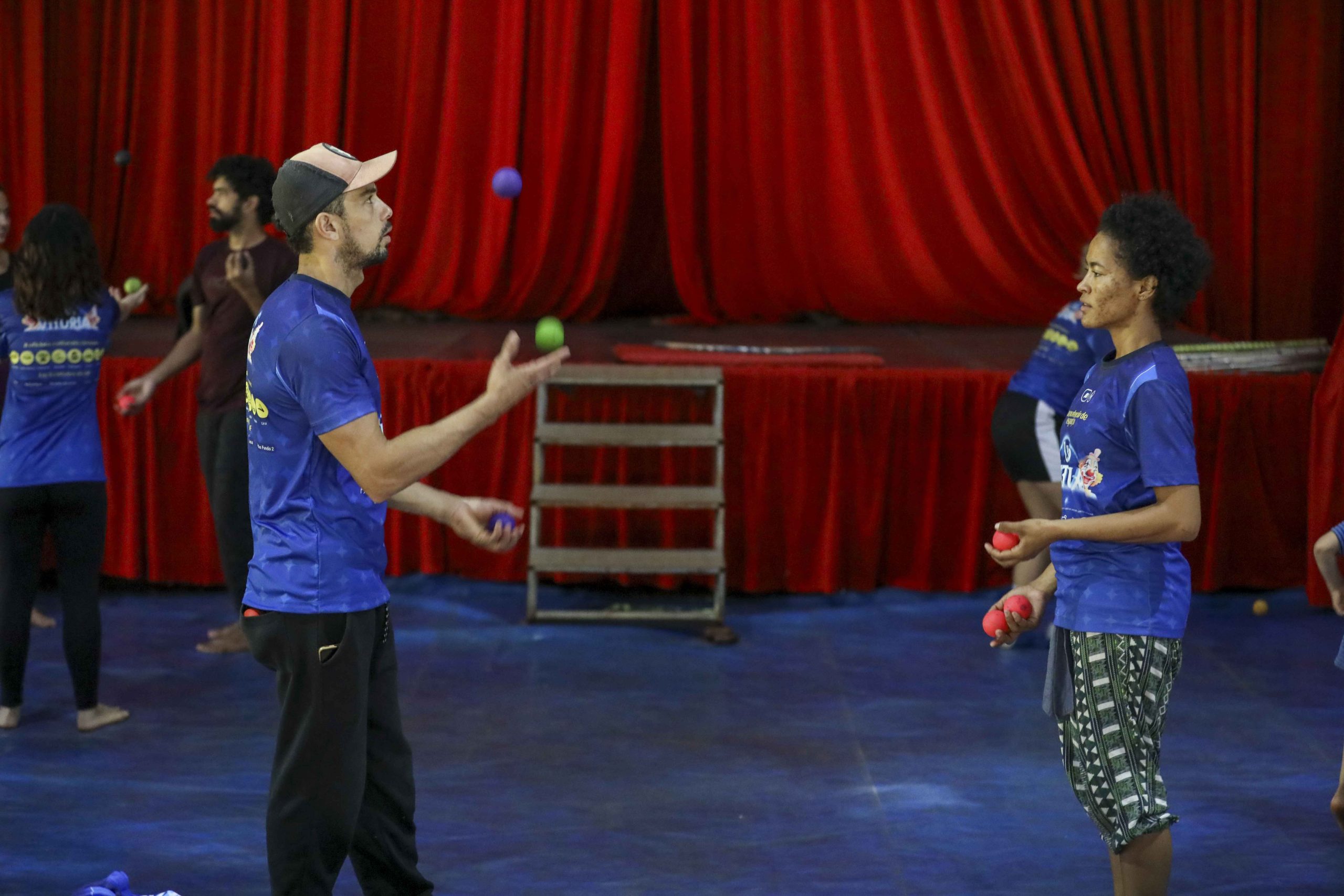 Atenção no picadeiro, é hora de oficina! Por trás da lona do Circo Vitória, no Gama, crianças e adolescentes desbravam técnicas da arte milenar circense. Bambolê, cama elástica, malabares, lira, slackline, tecido e trapézio são as opções ofertadas gratuitamente no contraturno escolar para a comunidade.