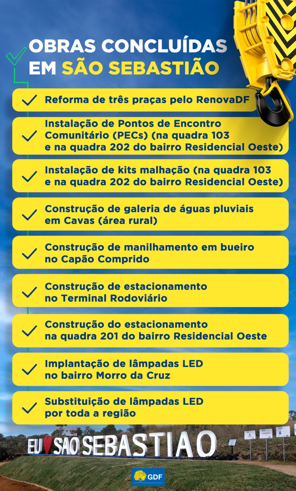 Obras estão no DNA de São Sebastião. Durante a construção da nova capital, a região abrigou olarias — locais em que são fabricados tijolos. Mais de seis décadas depois, a área, que virou região administrativa em 1993, vem sendo palco de uma série de trabalhos de construção e reforma feitos pelo Governo do Distrito Federal (GDF) para melhorar a vida dos cerca de 119 mil moradores.