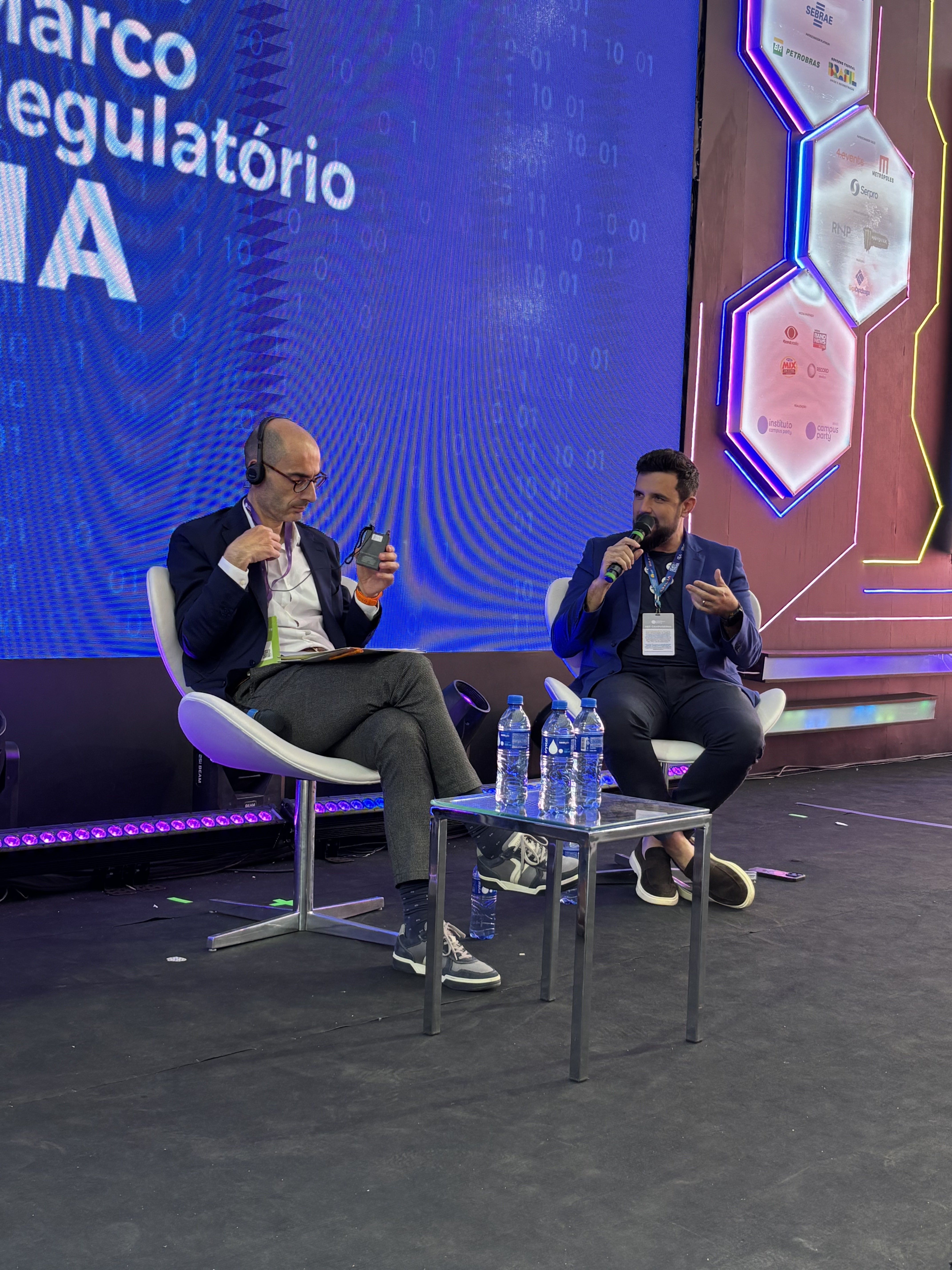Gabriele Mazzini (E), autor da Lei de Inteligência Artificial (AI Act) da União Europeia, com Leonardo Reisman, presidente da FAPDF, durante palestra na Campus Party | Foto: Divulgação/FAPDF