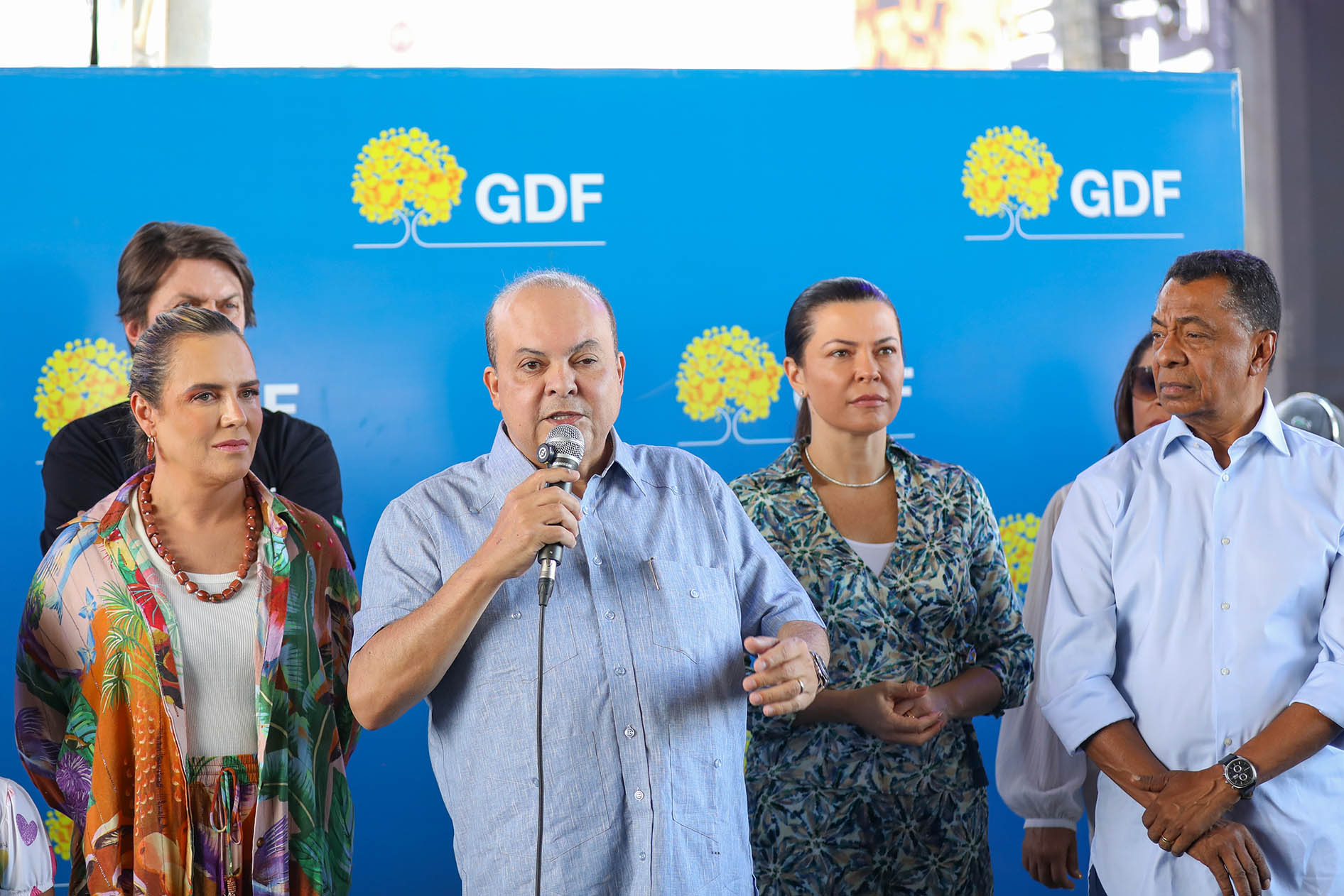 O governador Ibaneis Rocha (C) com o secretário de Cultura e Economia Criativa, Claudio Abrantes (atrás da vice-governadora Celina Leão), a secretária de Justiça e Cidadania, Marcela Passamani, e o deputado federal Damião Feliciano | Foto: Renato Alves/Agência Brasília