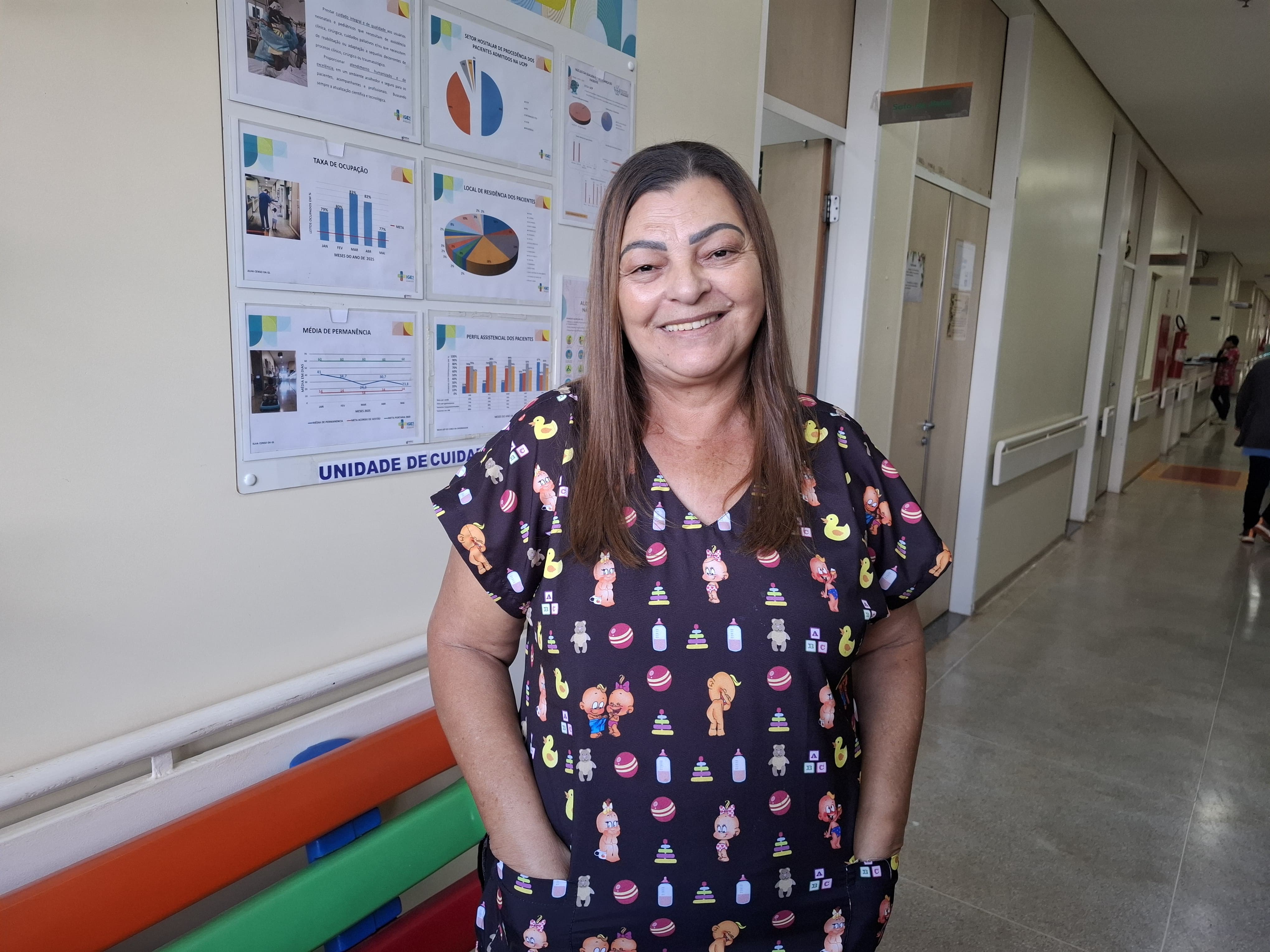 Na Unidade de Cuidados Prolongados Pediátricos, a técnica de enfermagem Antônia Pereira Damasceno é conhecida pela forma que se dedica aos pequenos pacientes. Há 15 anos no setor, ela assume o título de “vovó coruja” com orgulho: “Adoro pegar no colo, principalmente os que estão sozinhos. Todo mundo merece um aconchego. Fico ali presente, trocando fraldas, dando atenção, e isso faz toda a diferença”.