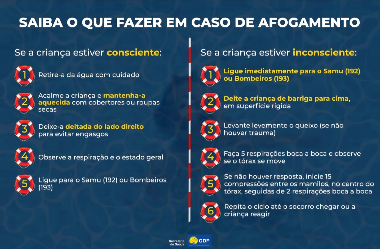 A instrutora do Núcleo de Ensino do Samu-DF, Lorhana Morais, reforça que a prevenção começa com a supervisão. “É importante sempre haver um adulto responsável observando as crianças. E não basta estar por perto: é necessário estar a um braço de distância para agir rapidamente se algo acontecer”, orienta.