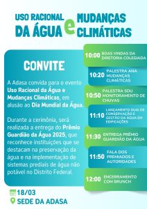Em comemoração ao Dia Mundial da Água, a Agência Reguladora de Águas, Energia e Saneamento do Distrito Federal (Adasa) realizará, na terça-feira (18), o evento “Uso Racional da Água e Mudanças Climáticas”. Das 10h às 12h, a programação vai promover o debate sobre o consumo consciente da água e os impactos das mudanças climáticas no Distrito Federal, com palestras de especialistas da Agência Nacional de Águas e Saneamento Básico (ANA) e da Adasa.