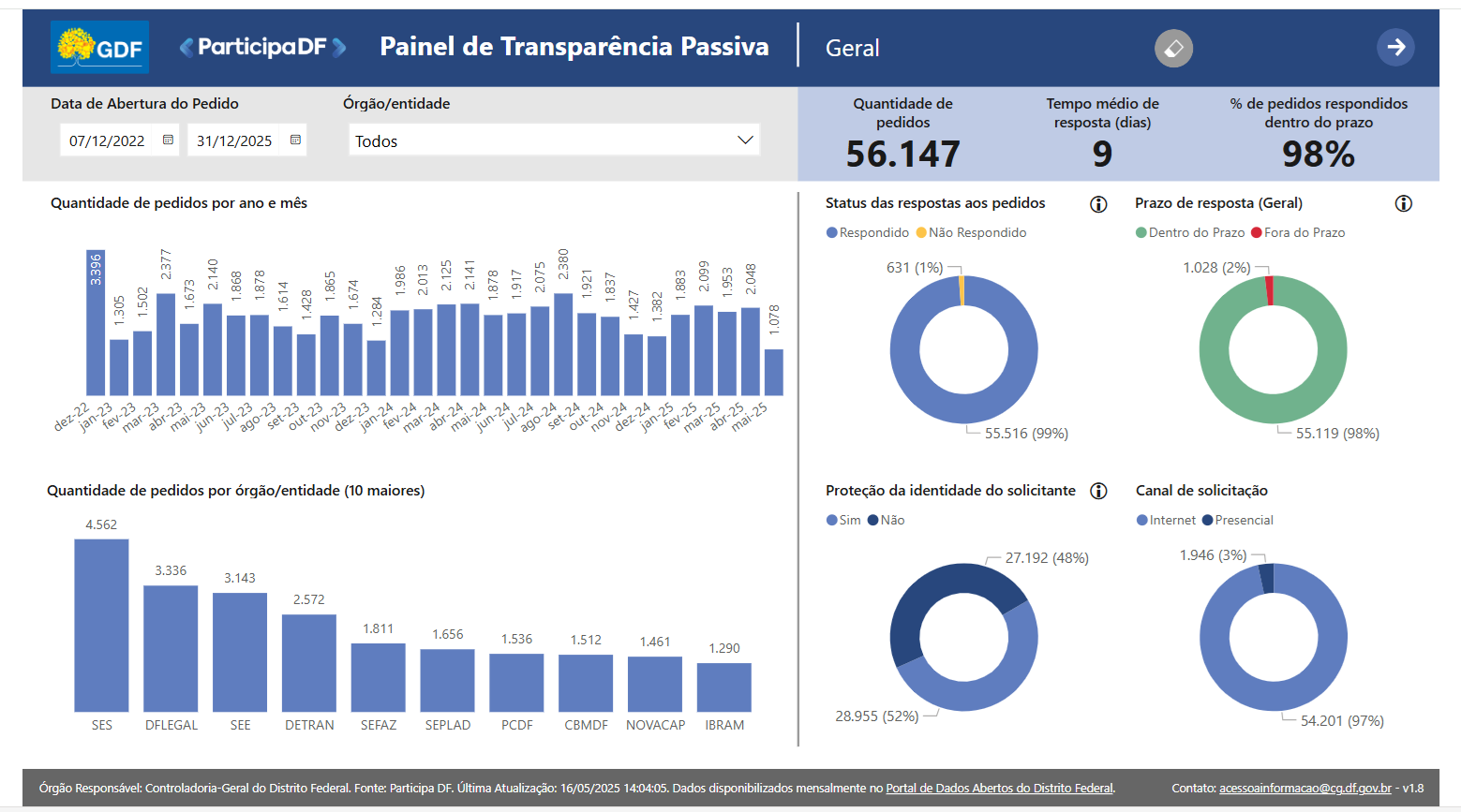 Essa informação pode ser acessada no Painel de Transparência Passiva do DF, ferramenta lançada pela Controladoria-Geral do Distrito Federal (CGDF) para facilitar a visualização dos dados, o que foi um passo importante no que diz respeito à transparência da execução da LAI no DF.