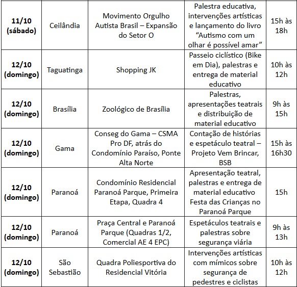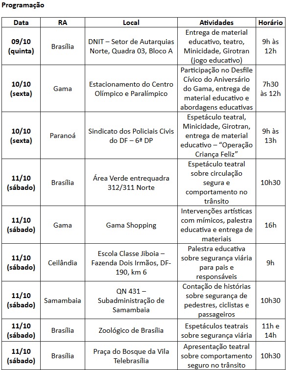 O Departamento de Trânsito do Distrito Federal (Detran-DF) preparou uma série de atividades educativas e lúdicas para celebrar o Dia das Crianças. A programação ocorre até 12 de outubro, em várias regiões administrativas do DF, com o objetivo de incentivar a formação de cidadãos mais conscientes e responsáveis no trânsito.