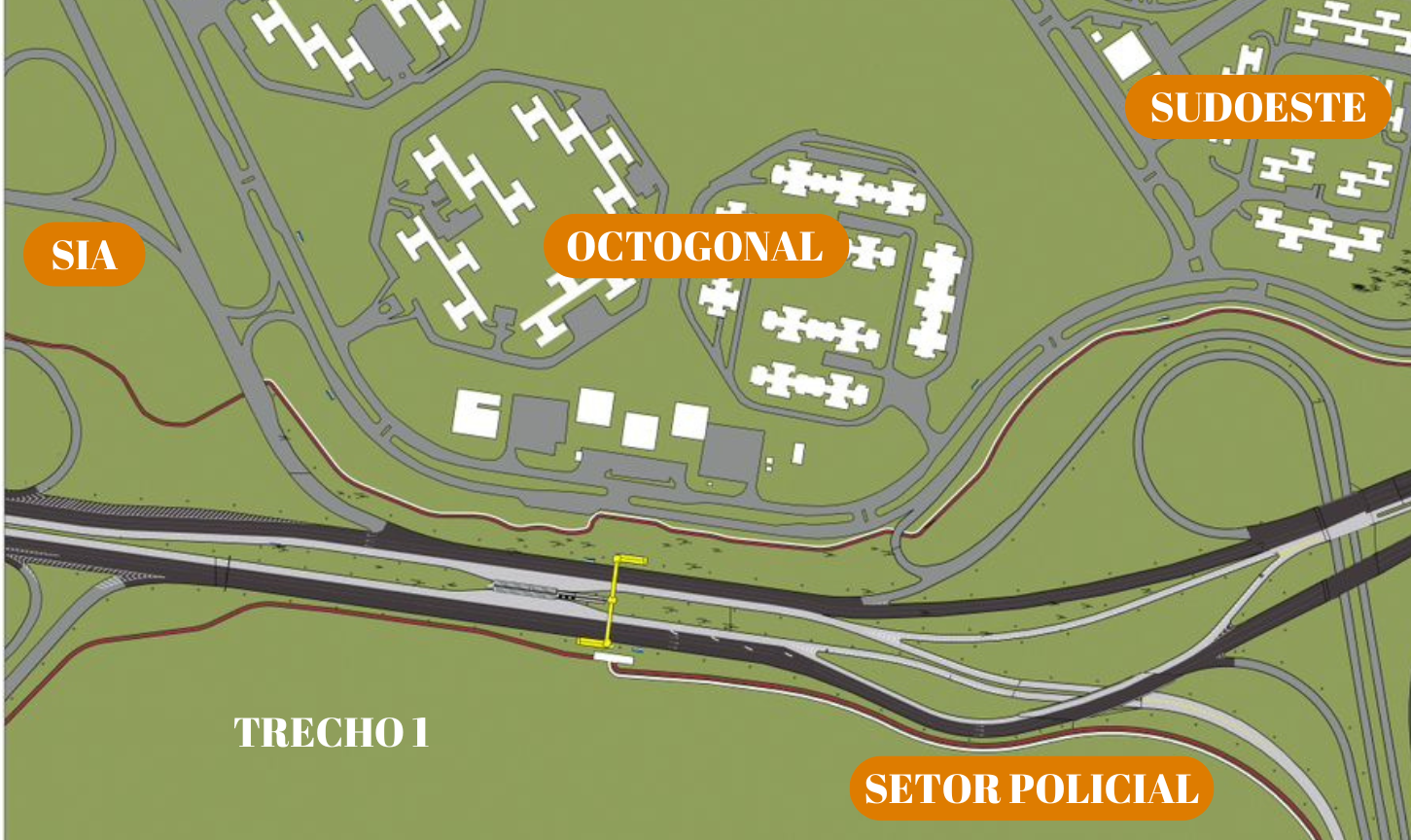 O primeiro trecho, situado entre os viadutos da Estrada Parque Indústria e Abastecimento (Epia) e do Setor Policial Sul, abrange a implantação da pista do BRT, a construção de dois novos viadutos, instalação de ciclovias, obras de drenagem, pavimentação, sinalização, paisagismo, calçadas e mobiliário urbano.