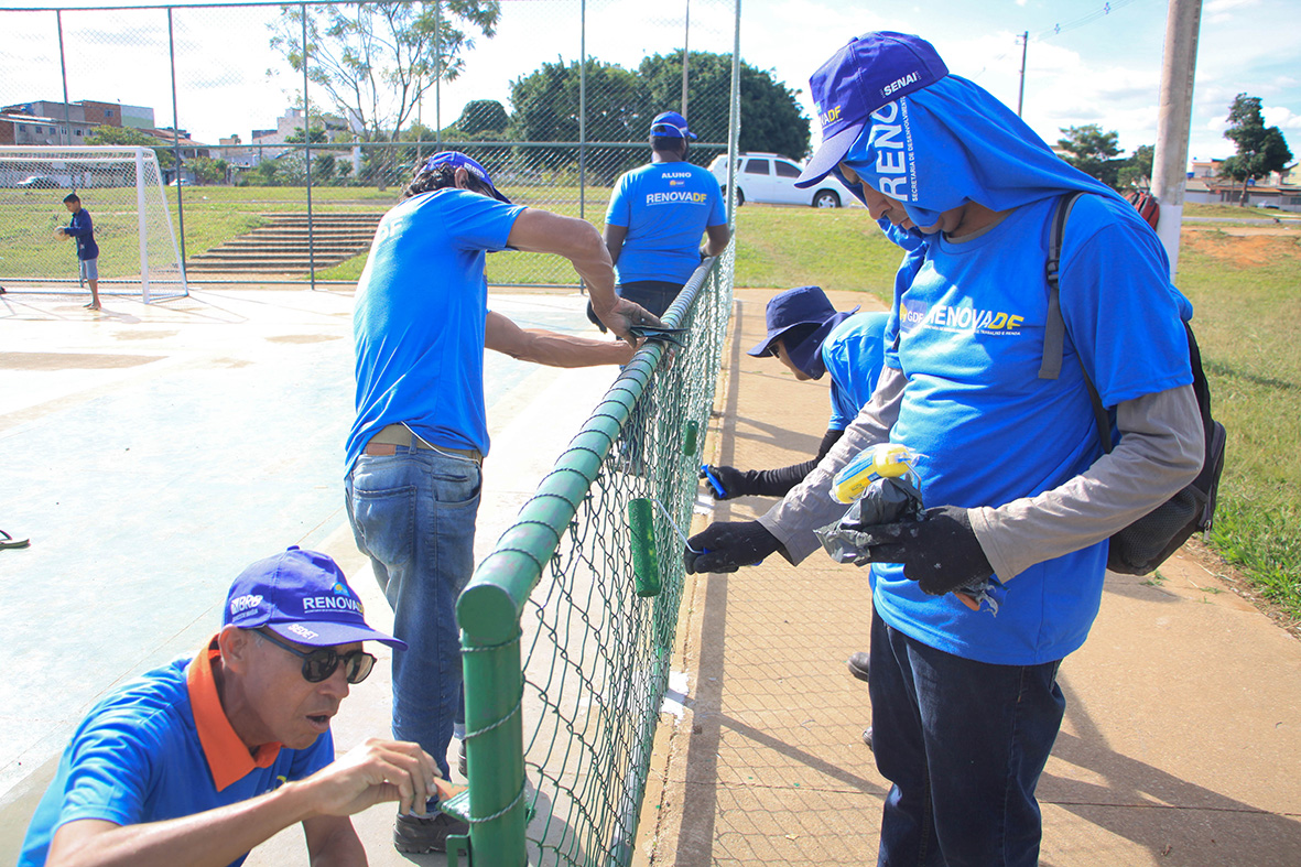 Cerca de 100 alunos do RenovaDF estão reformando os espaços esportivos da QE 38 do Guará. A ação começou em maio e contempla o skatepark, a quadra poliesportiva, o parquinho infantil, os equipamentos de calistenia e a praça da região, utilizados diariamente pelos moradores para convivência e desporto.