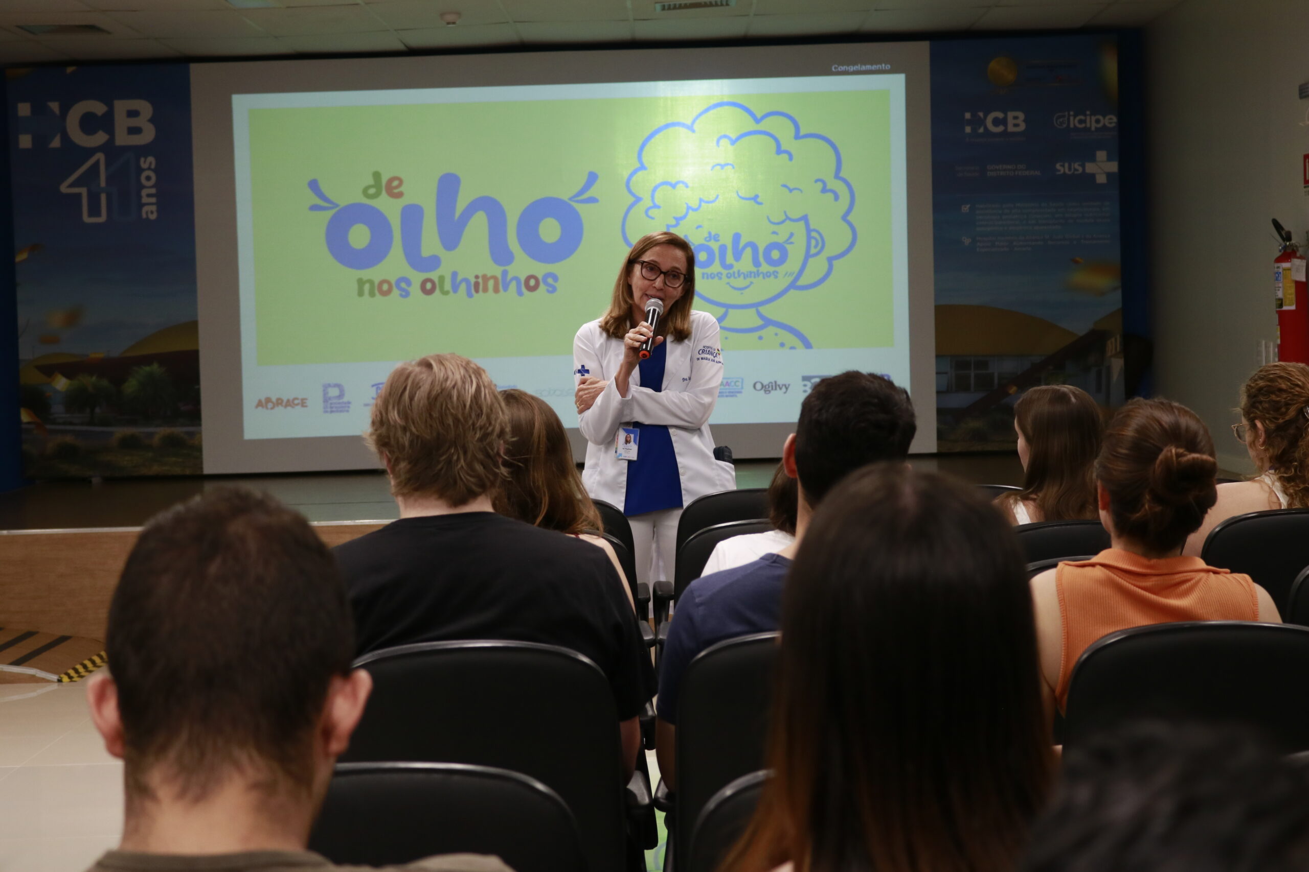 Estudantes de medicina do Distrito Federal que vão se unir ao hospital na campanha participaram, nesta sexta-feira (8), de uma aula sobre retinoblastoma organizada pelo HCB e conduzida pela diretora técnica do hospital, Isis Magalhães, e pela oftalmologista do Hospital Regional da Asa Norte (Hran) Manuella Nader.