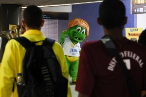 O mascote dos JEBs, conhecido como JacaJEBs, marcou presença e interagiu com os alunos que desembarcaram no Recife para competir