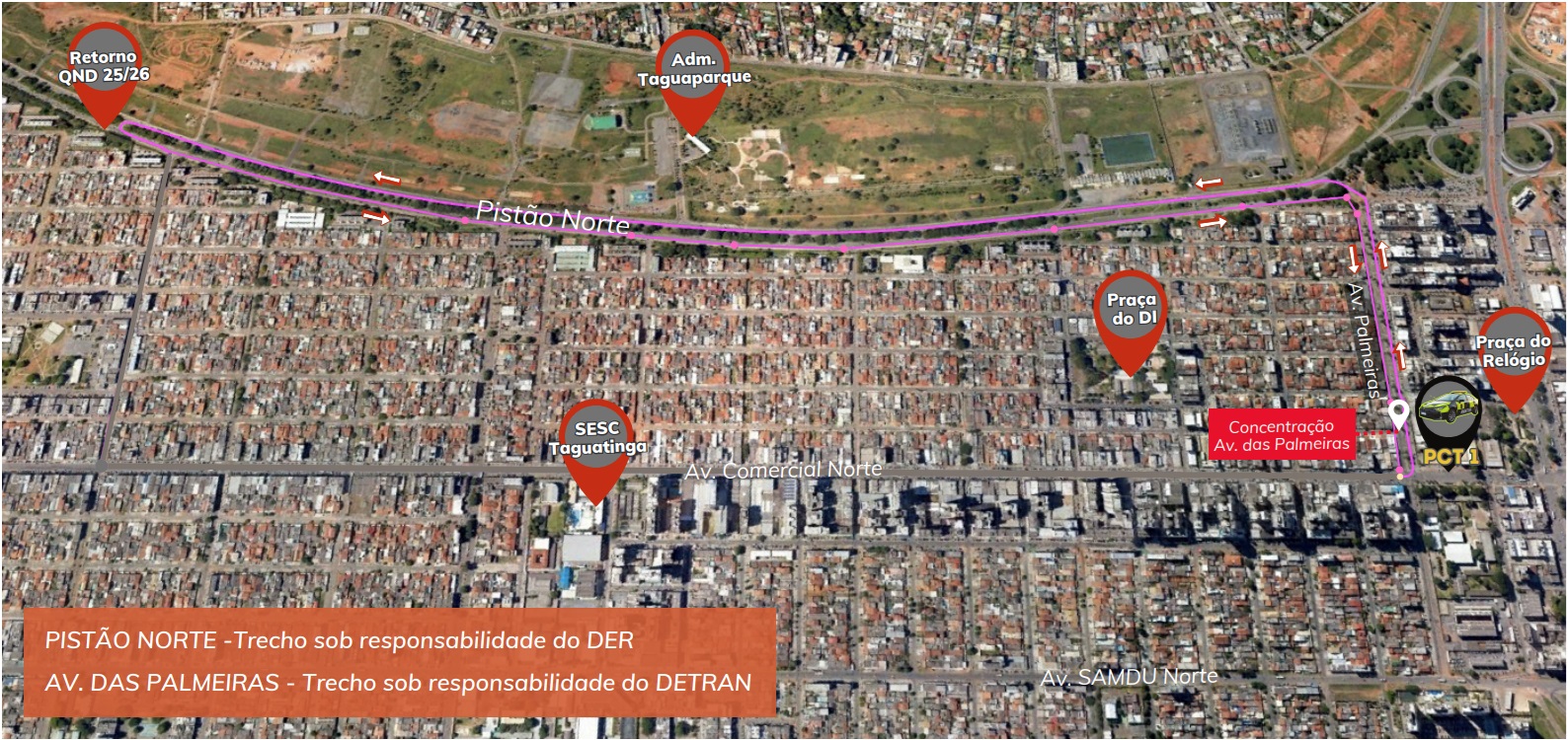 Durante o trajeto, as equipes de fiscalização farão as interdições necessárias para a passagem do público. Na Avenida das Palmeiras os agentes do Detran-DF atuarão no fechamento dos acessos e nas ações de segurança viária, já no Pistão Norte o controle do tráfego será realizado pelo Departamento de Estradas de Rodagem (DER-DF). A previsão é que a interdição na Avenida das Palmeiras ocorra até as 23h.