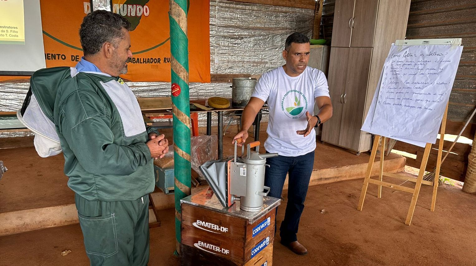 Um apiário coletivo será implantado no pré-assentamento Pôr do Sol, em Sobradinho, para produção de mel e outros produtos apícolas. A comunidade recebeu 12 caixas completas, balde em inox com peneira e um fumigador, provenientes de convênio entre a Empresa de Assistência Técnica e Extensão Rural do Distrito Federal (Emater-DF) e a Companhia de Desenvolvimento dos Vales do São Francisco e do Parnaíba (Codevasf) para desenvolvimento da Rota do Mel.