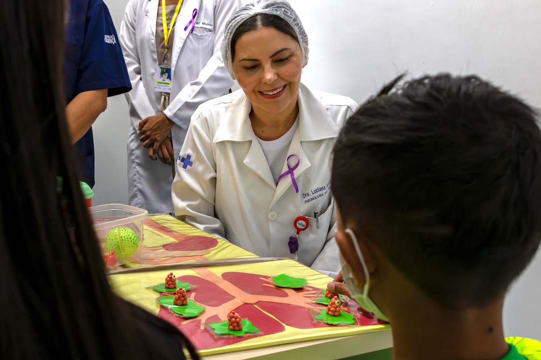 “Nosso cuidado é interdisciplinar, onde o paciente é acompanhado por cerca de oito especialidades, incluindo gastroenterologia, pneumologia, fisioterapia, psicologia, nutrição, farmácia, enfermagem e assistência social”, detalha Luciana Monte, coordenadora da equipe de pneumologia do HCB. Monte – que também é presidente da Sociedade de Pediatria do Distrito Federal (SPDF) – explica que, embora não seja uma doença contagiosa, pacientes com fibrose cística devem ser separados entre si para evitar o risco de contaminação cruzada por bactérias contidas nas secreções, que podem piorar o prognóstico.