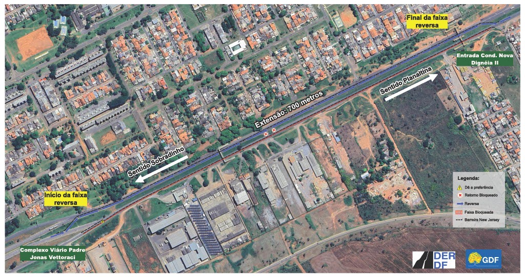 Durante as intervenções, será feita a reversão de faixas no trecho de Sobradinho a Planaltina para permitir que o tráfego siga com duas faixas em cada sentido. A partir das 9h desta terça-feira (29), haverá uma inversão para quem sai do viaduto de acesso a Sobradinho, no sentido Planaltina, para fornecer segurança aos trabalhadores que atuam na obra e aos motoristas que transitam na via.