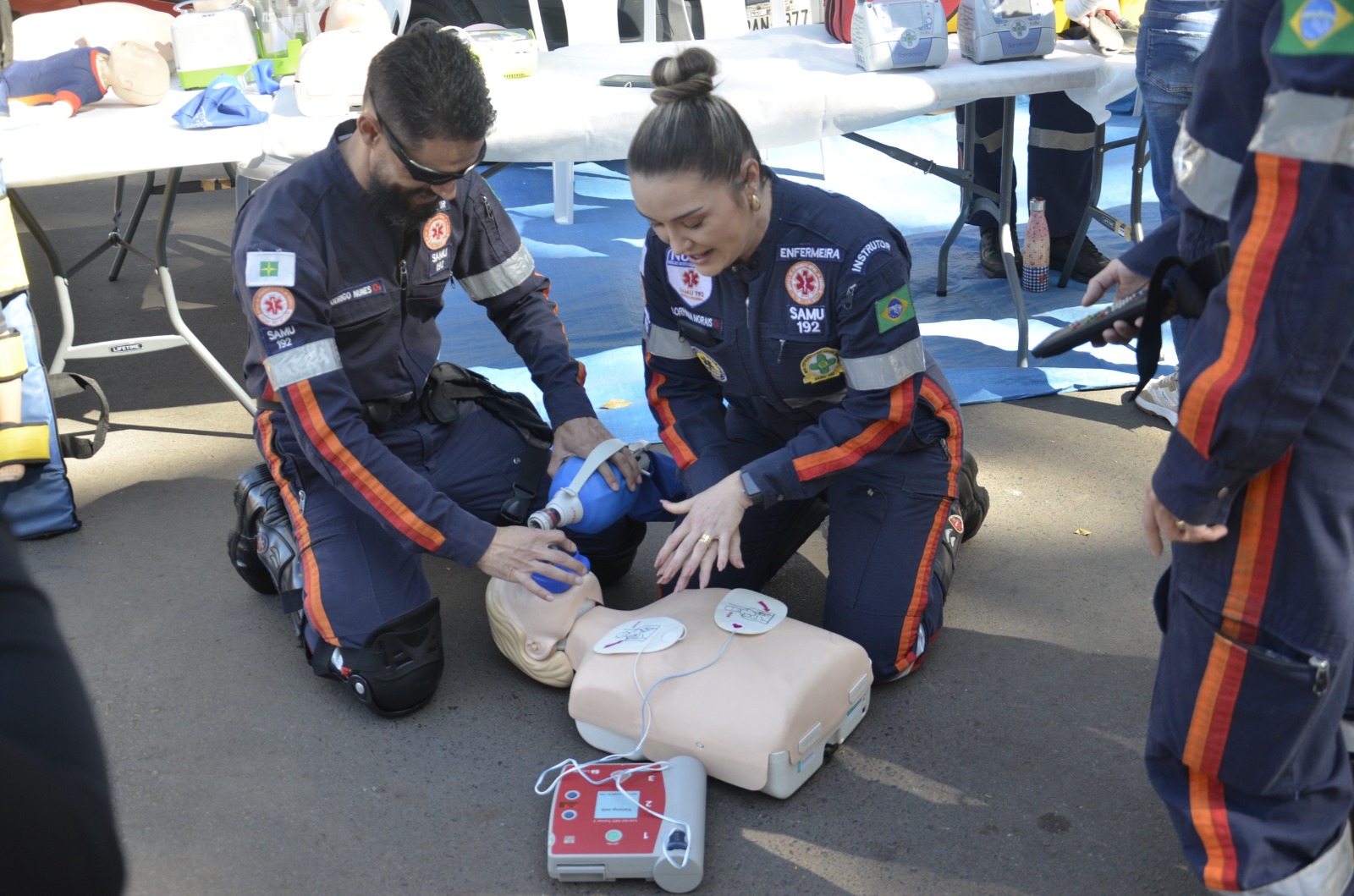 Profissionais do Samu fizeram demonstrações em primeiros-socorros com técnicas de desobstrução de vias aéreas, compressão cardíaca e reanimação
