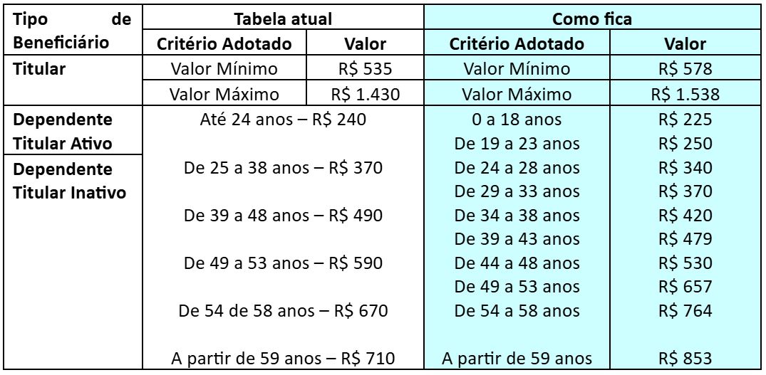 Confira no quadro abaixo como ficará a contribuição mensal: