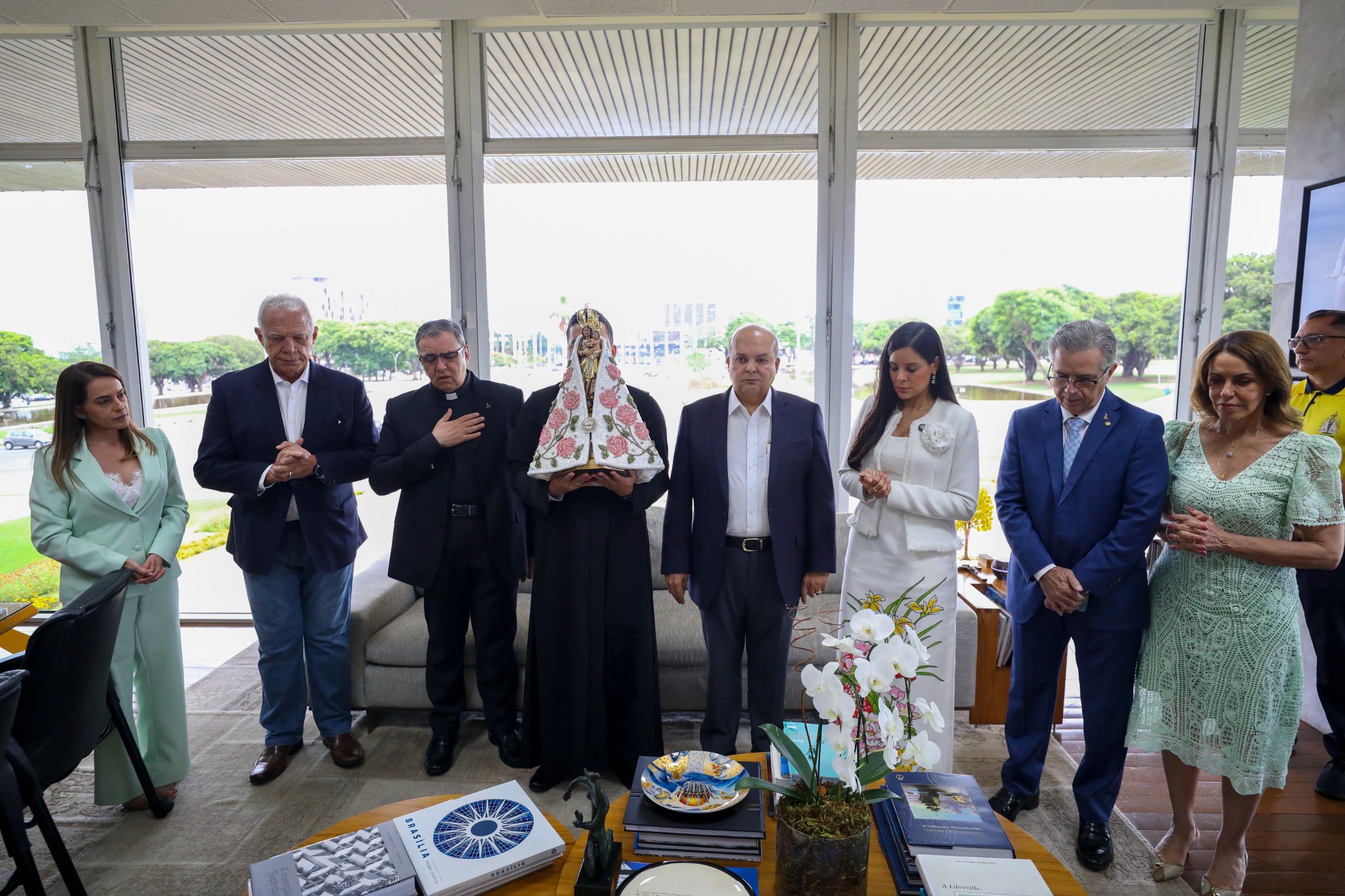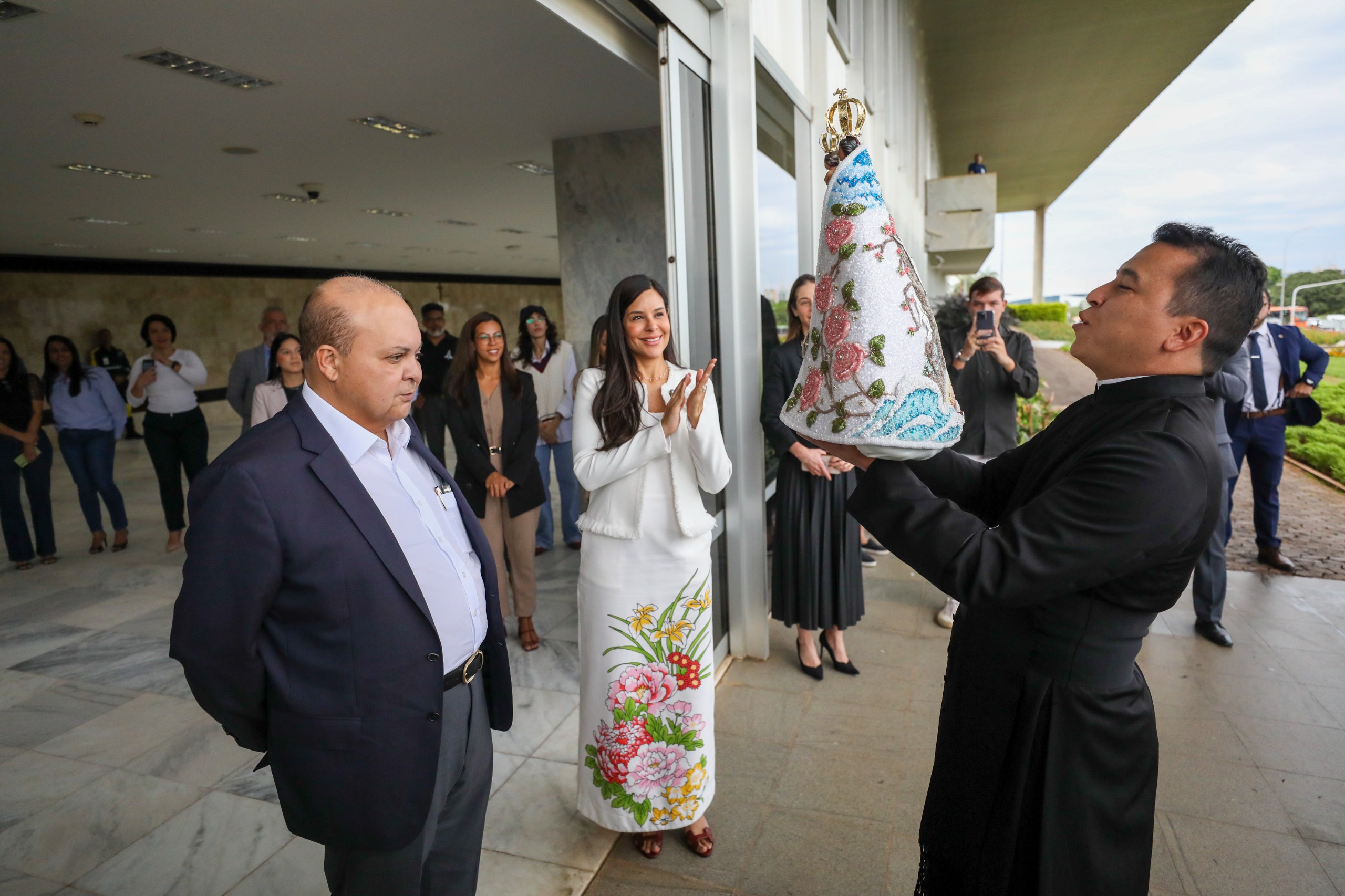 A chegada da imagem ao palácio foi marcada por momentos de fé. Ela foi levada até o gabinete do governador Ibaneis Rocha pelo padre Rafael e acompanhada por membros do governo, incluindo a primeira-dama Mayara Noronha Rocha e o secretário de Governo, José Humberto Pires de Araújo.