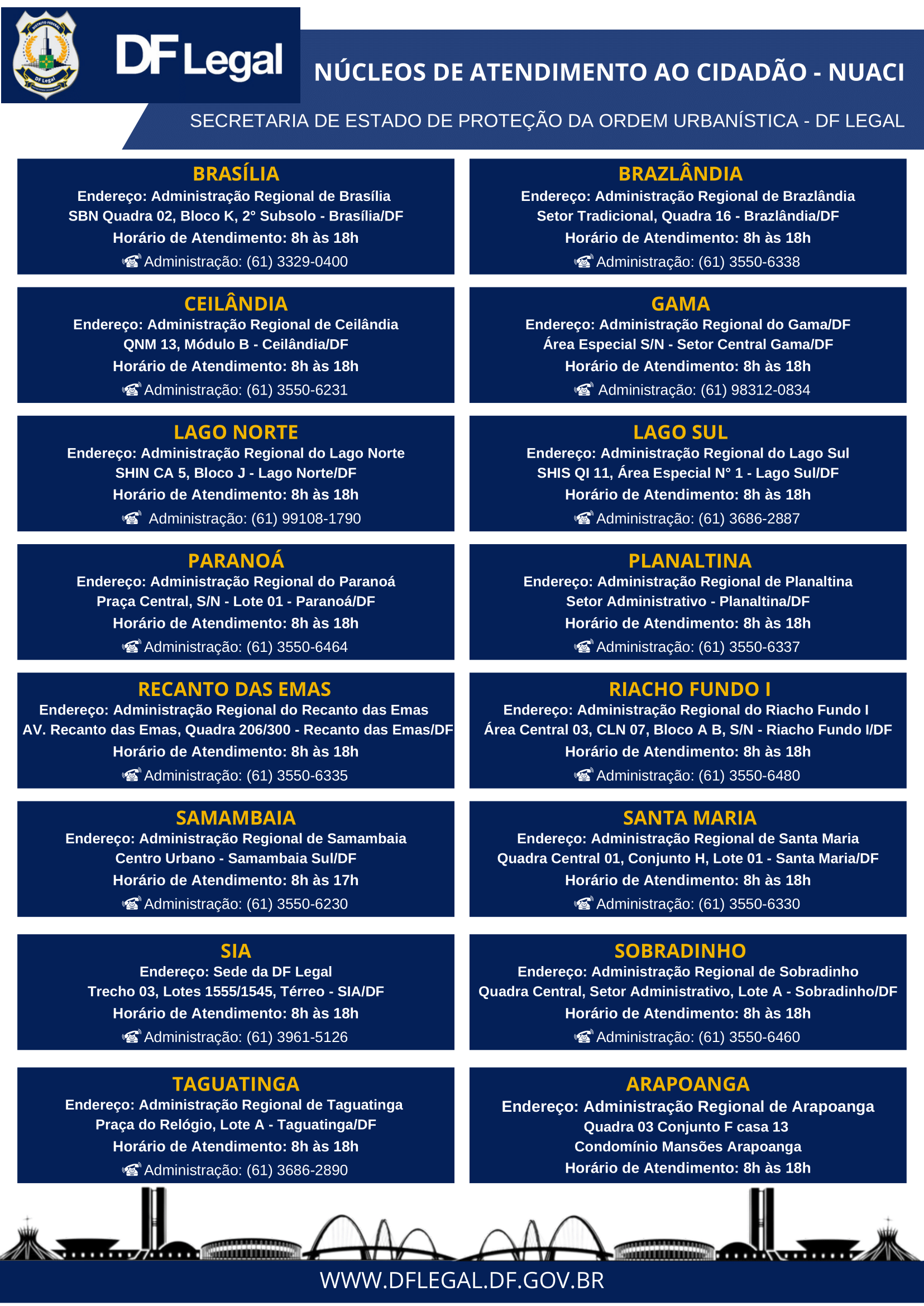 Com o objetivo de descentralizar os serviços e aproximá-los da comunidade, a Secretaria de Proteção da Ordem Urbanística (DF Legal) inaugurou o 16º Núcleo de Atendimento, localizado na Administração Regional do Arapoanga. Os atendimentos ao público começaram na tarde da última sexta-feira (18) e têm horário de funcionamento de segunda a sexta, das 8h às 18h. No espaço, o contribuinte pode ter atendimento de 12 diferentes serviços, como prorrogação de auto de notificação, lançamento de taxas e preços públicos e emissão de nada consta.