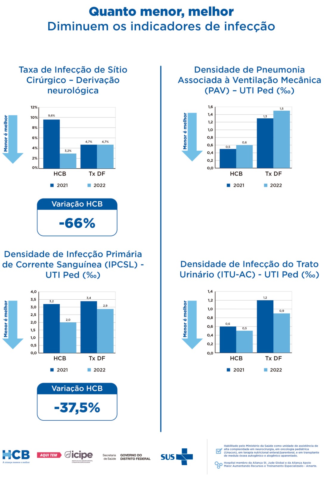 O Hospital da Criança de Brasília José Alencar (HCB) apresentou, em 2022, melhoria nos índices de controle de infecções relacionadas à assistência. Os dados são provenientes de um relatório divulgado pela Gerência de Risco em Serviços de Saúde (GRSS) da Secretaria de Saúde do Distrito Federal (SES-DF). O HCB demonstrou bons resultados quando comparado com os outros hospitais quanto aos índices anteriores do próprio hospital, referentes ao ano de 2021.