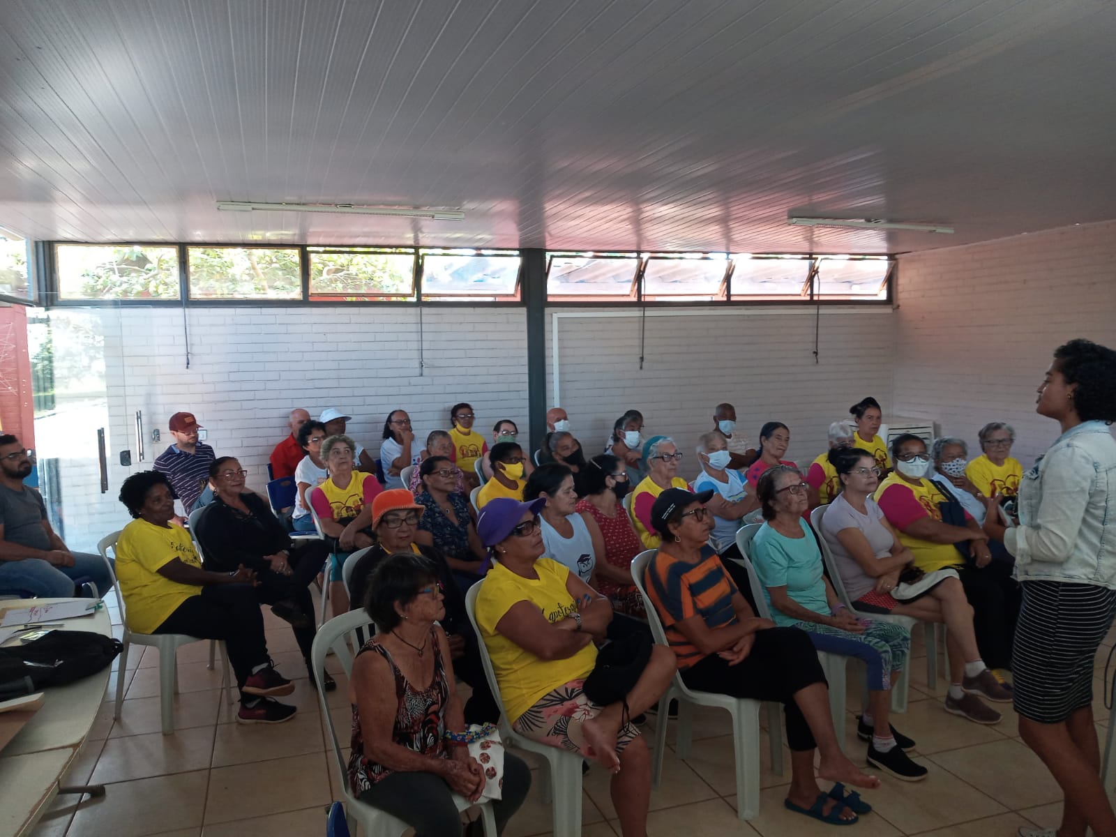 Grupo de idosos atendidos pelo Cecon Gama Sul assiste ao documentário | Foto: Divulgação/Sedes