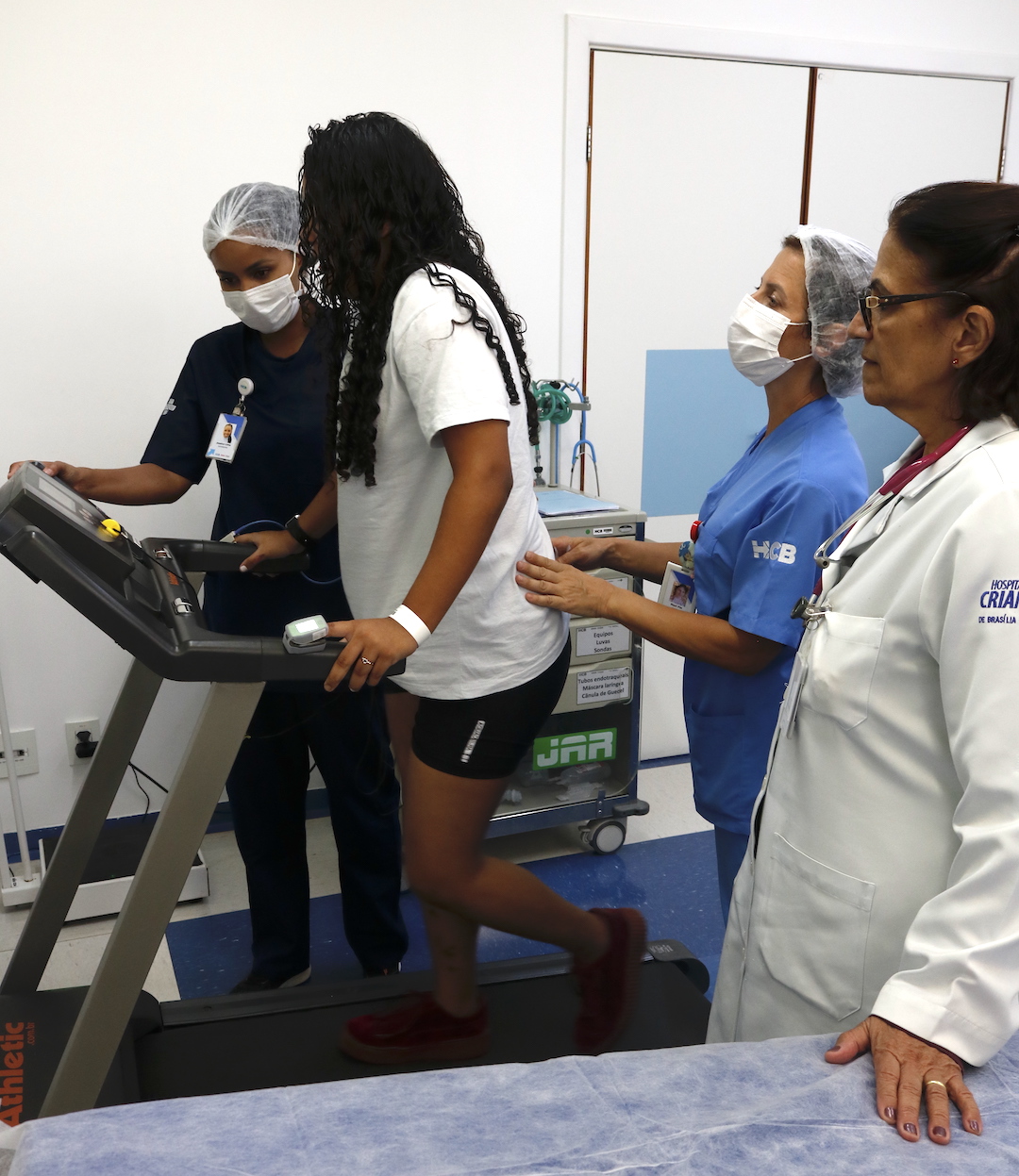 O exame, realizado com esteira ou bicicleta ergométrica, verifica a reação do pulmão à atividade física – informação importante para o diagnóstico. “Poucos lugares no Brasil fazem esse teste, ainda mais para o público pediátrico. No Distrito Federal, só o HCB realiza. Fazemos o teste em crianças com mais de seis anos de idade, porque já conseguem fazer esteira”, explica a pneumologista do HCB Carmen Martins.