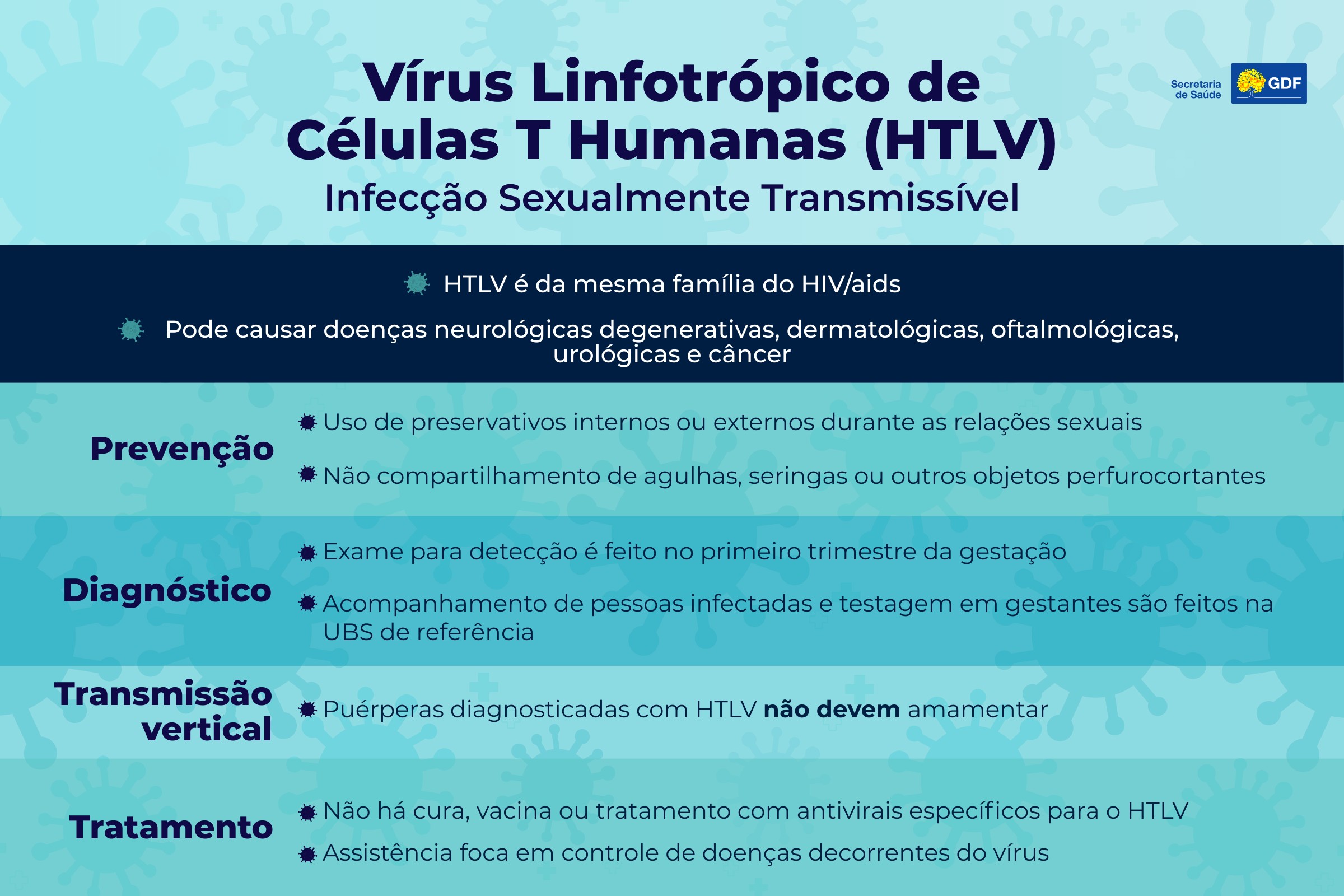 O HTLV tem semelhanças com o HIV, vírus causador da Aids, também sendo uma das infecções sexualmente transmissíveis (ISTs) que afeta o sistema imunológico. No caso das gestantes, a preocupação é maior: uma mãe pode contaminar um bebê por meio da amamentação. Por este motivo, em 2024, a Lei nº 7.619 determinou a inclusão do teste de detecção do vírus na lista de exames obrigatórios no pré-natal das gestantes do Distrito Federal.