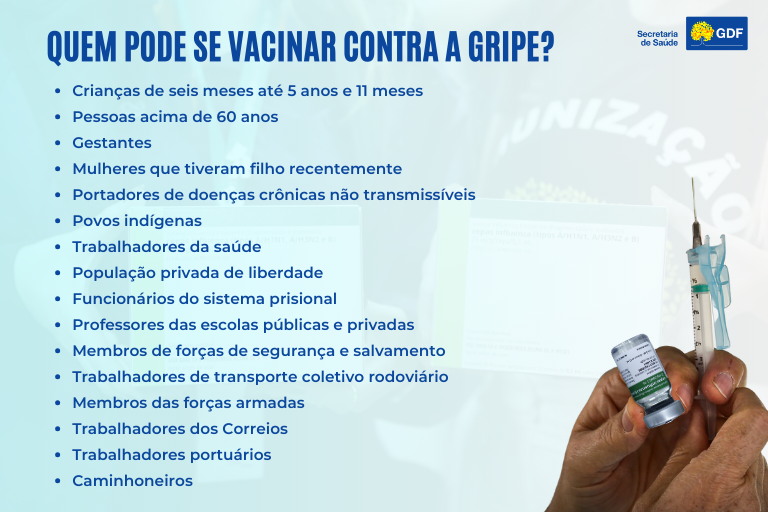 Dentre os grupos prioritários, estão idosos com 60 anos ou mais, crianças de 6 meses a 5 anos e 11 meses, gestantes e professores das redes públicas e privadas (veja no quadro ao final da matéria). Para atender a todos os públicos estabelecidos pelo Ministério da Saúde, o DF já recebeu o primeiro lote com cerca de 80 mil doses contra a influenza.
