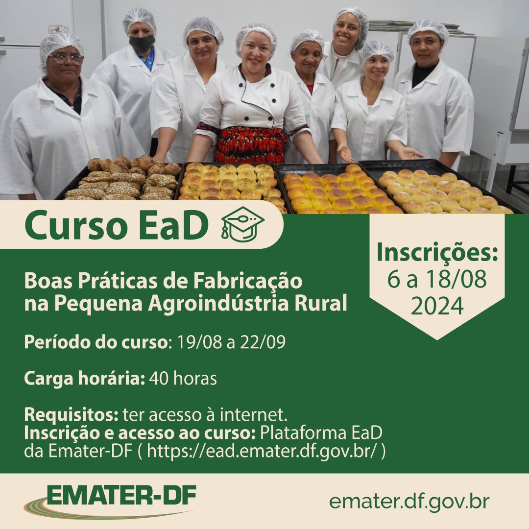 Estão abertas as matrículas para o curso da Empresa de Assistência Técnica e Extensão Rural do Distrito Federal (Emater) sobre boas práticas de fabricação para pequenas agroindústrias rurais. As inscrições podem ser feitas neste link até 18 de agosto e o participante pode acessar o curso a partir do dia 19.